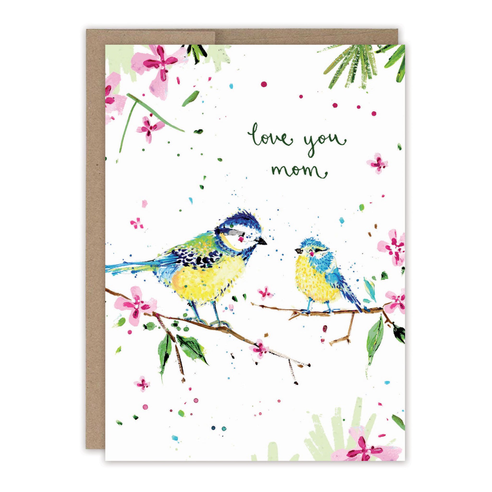 A tender Mother’s Day card featuring a sweet pair of birds perched among blossoms with the message “love you mom.” A heartfelt way to say thanks and share love.