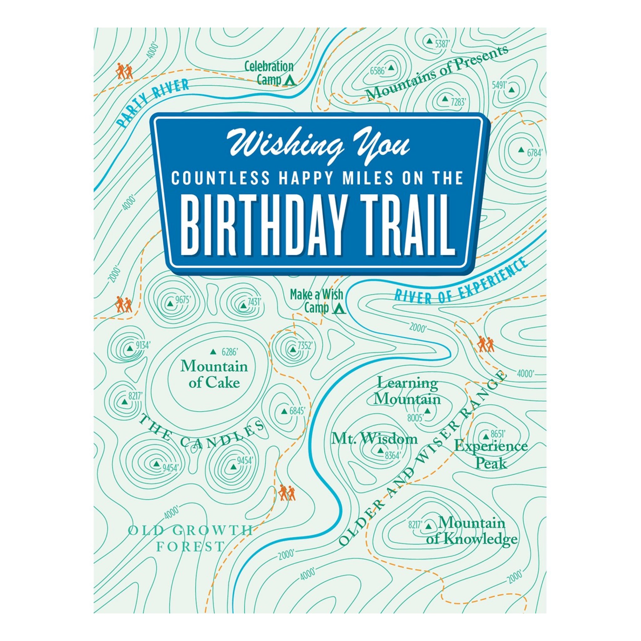 A playful birthday card with a topographic map design and the message “Wishing you countless happy miles on the birthday trail.” Blank inside for your note.