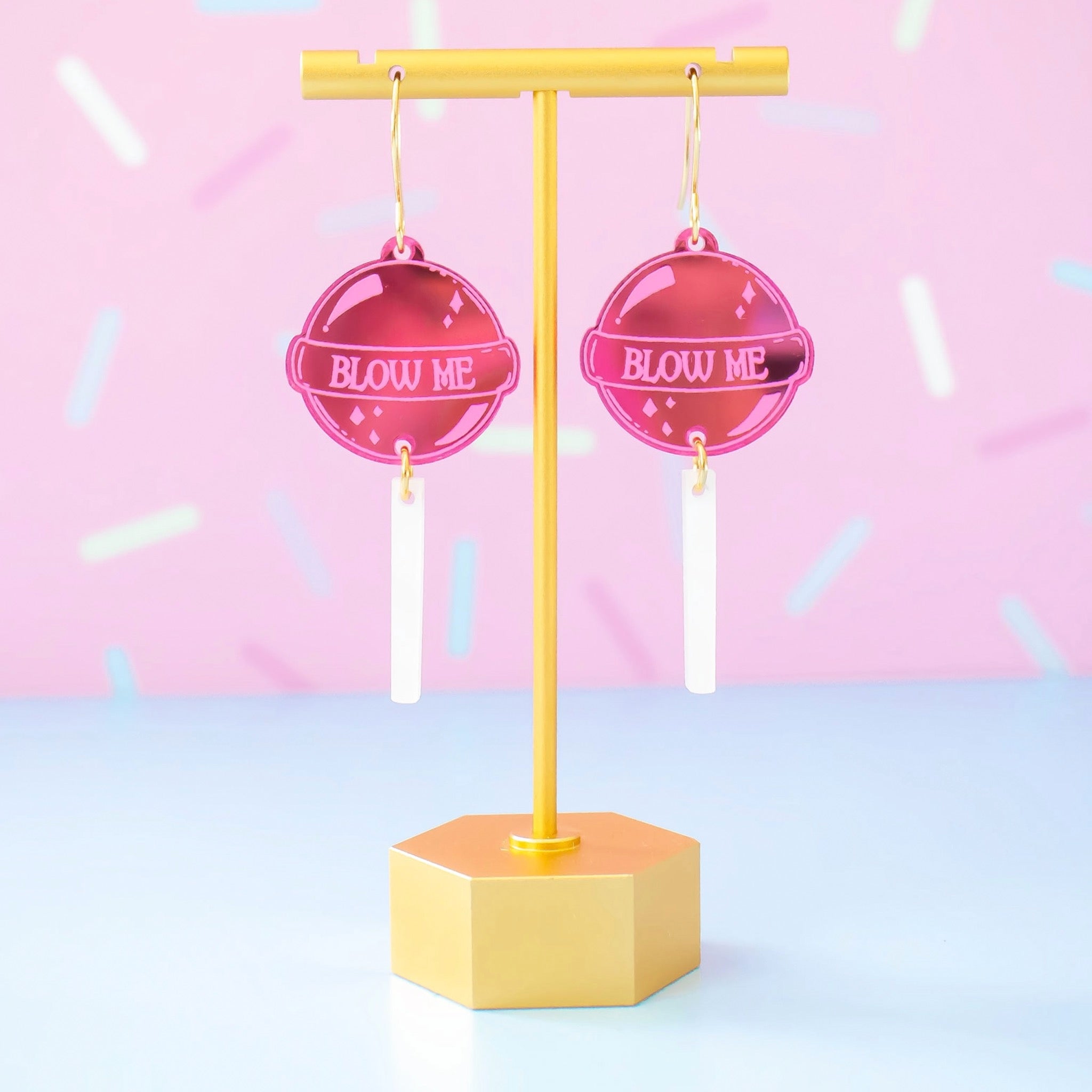 Sweet with a wink. These bold lollipop earrings mix glossy pink mirror acrylic and playful attitude for a lightweight statement that’s cheeky, fun, and impossible to ignore.