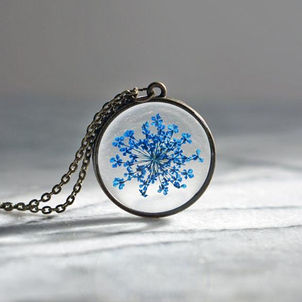 Encased in jewelry-grade resin, the Blue Queen Anne's Lace Necklace Antique Bronze features a deep blue dyed flower within an elegant antique bronze bezel. Ideal for those who appreciate timeless beauty.