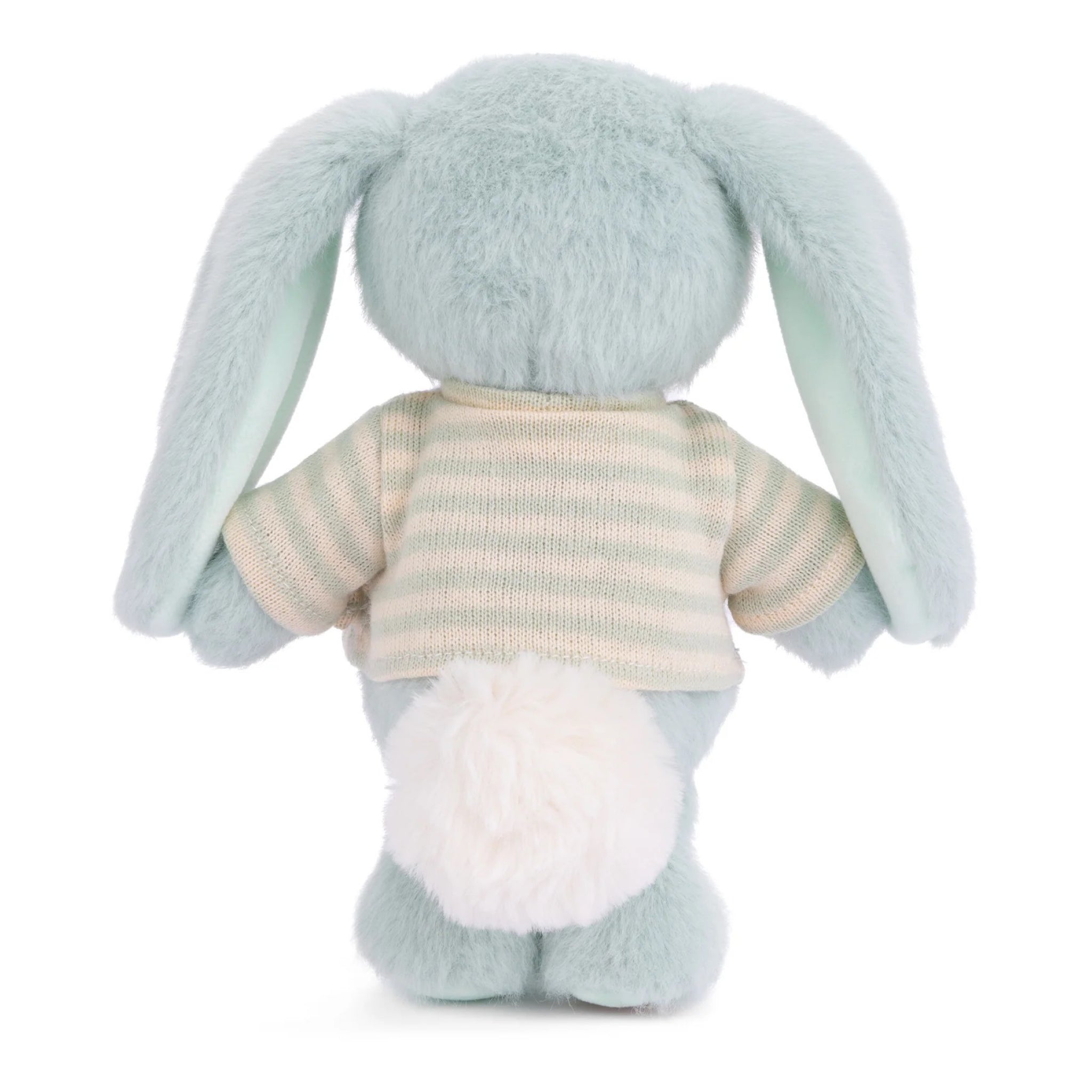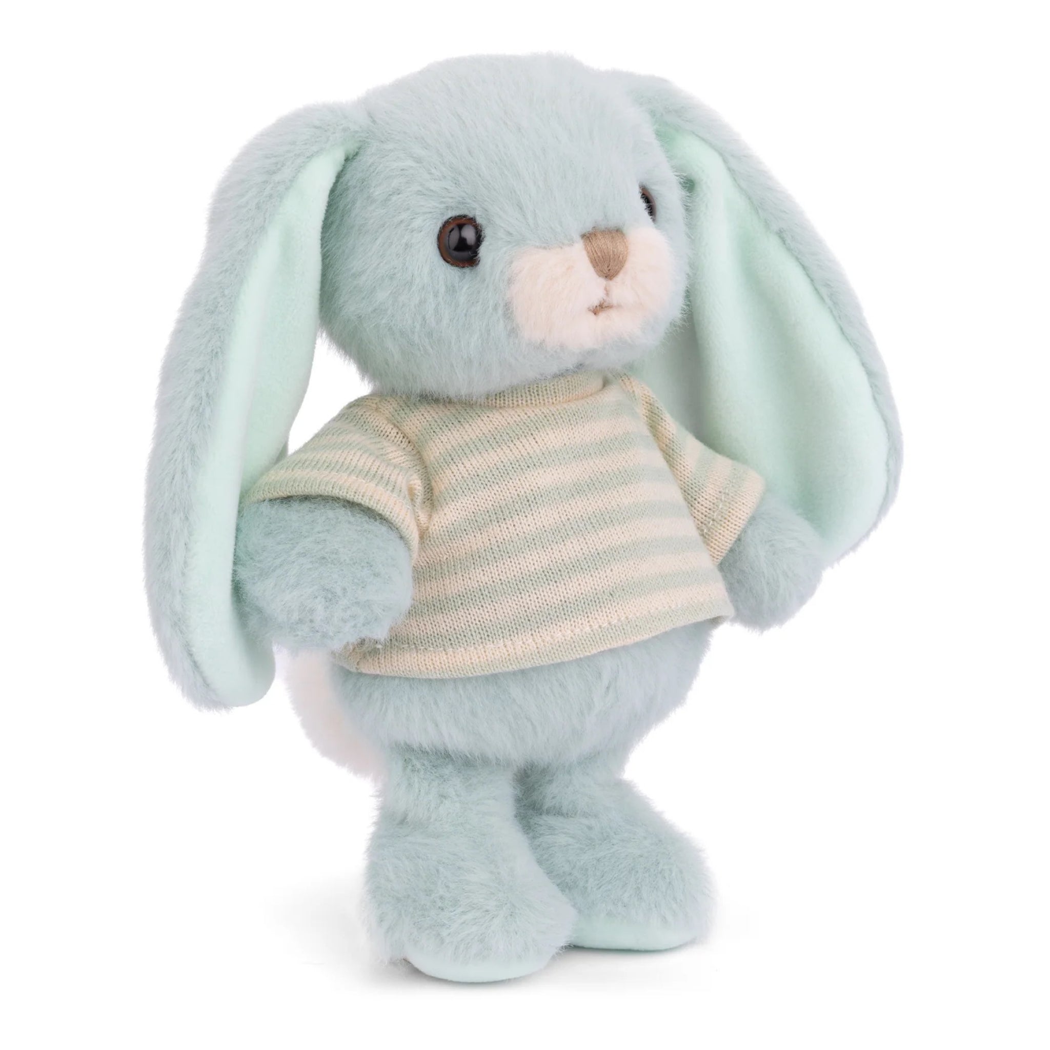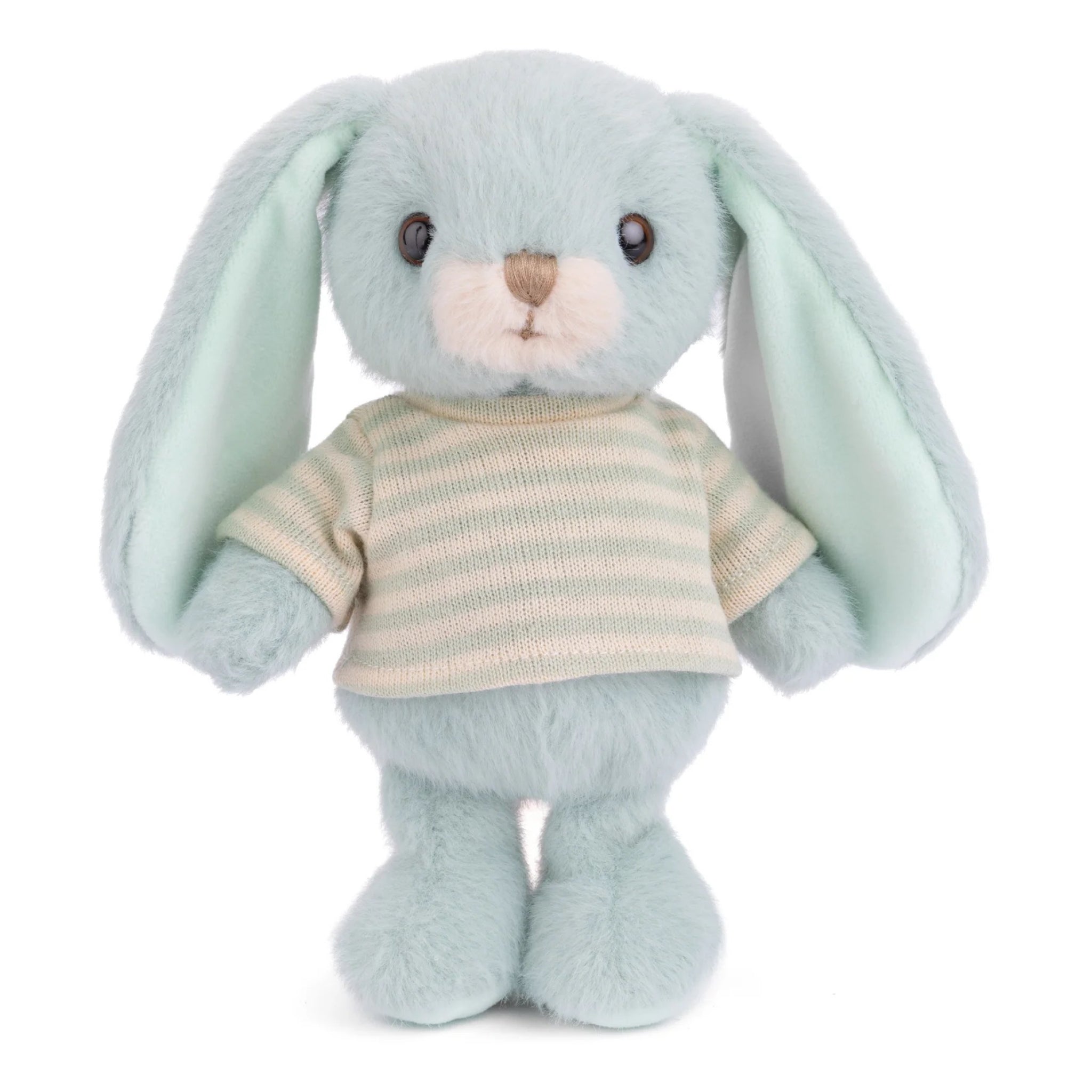 This super soft Bouncy Bunny plush in a gentle blue hue is dressed in a cozy striped top and ready for cuddles. A sweet and snuggly companion for little ones and bunny lovers alike.