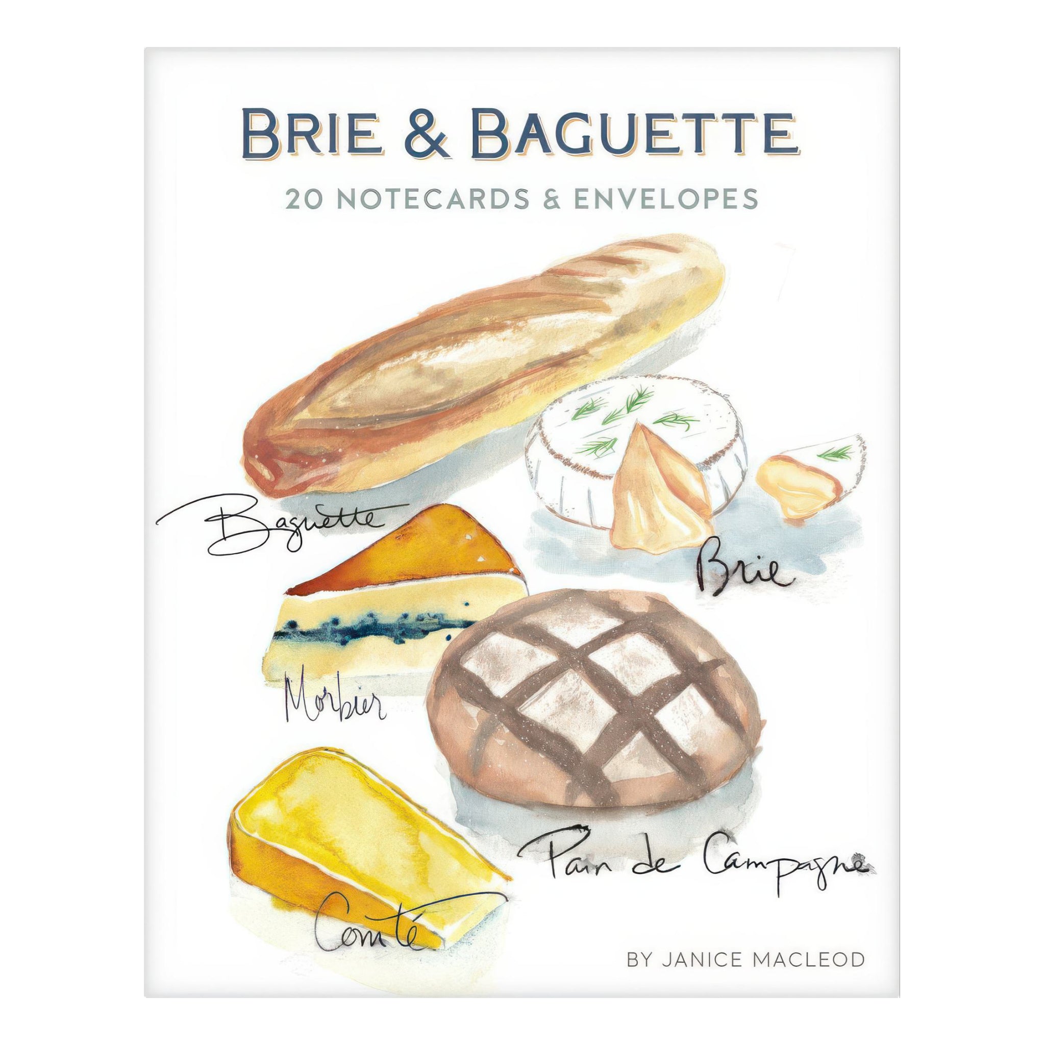 A boxed set of notecards inspired by a French boulangerie, featuring Janice MacLeod’s watercolor brie, baguettes, and pastry daydreams. Inside, a sweet bonjour message sets the tone for thank you notes, birthdays, and everyday snail mail.