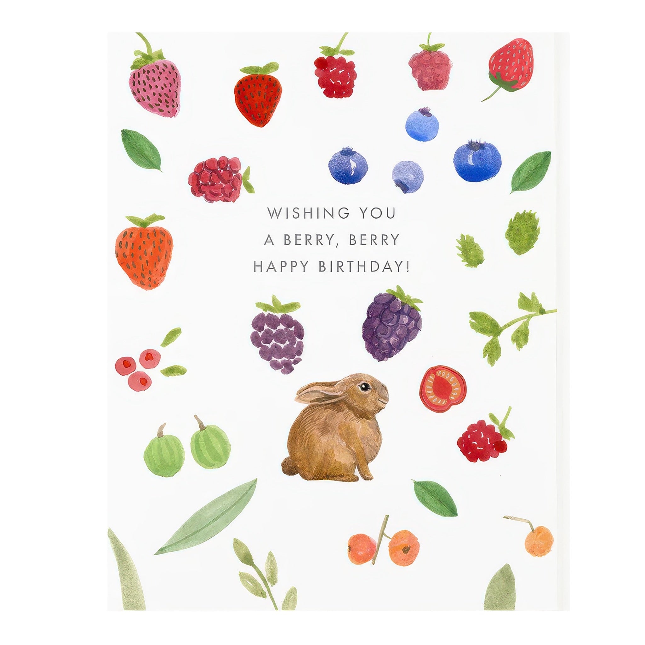 A fuzzy brown bunny surrounded by juicy berries makes their birthday extra sweet. This charming card features a hand painted illustration and is blank inside for your personal message.