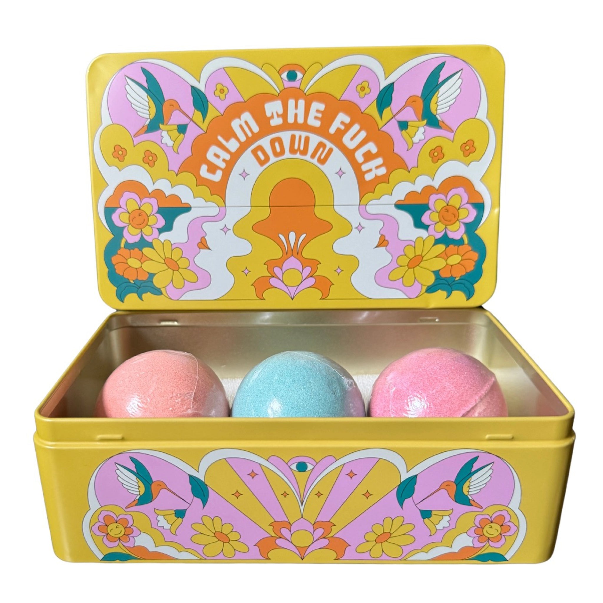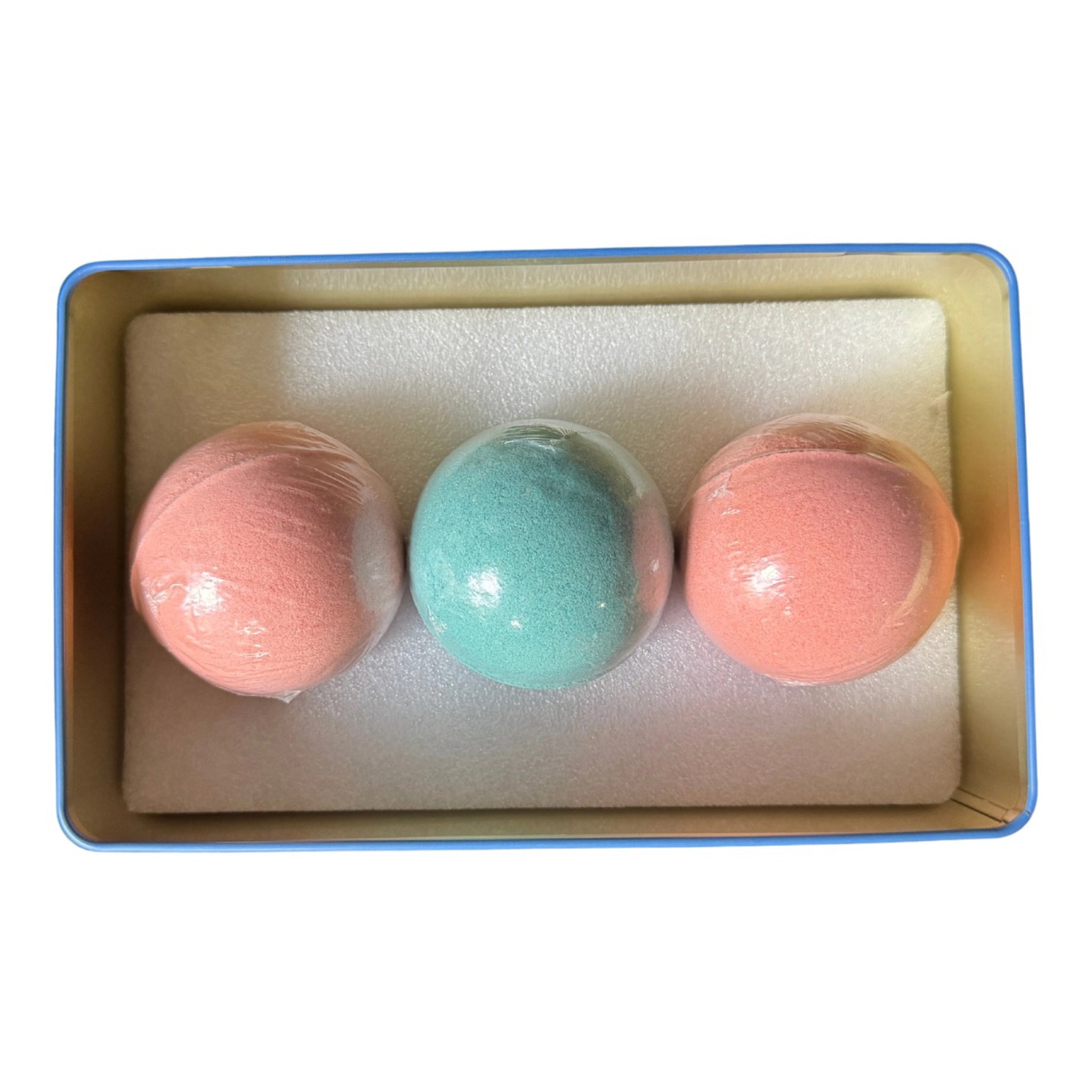 - Includes: 3 bath bombs and reusable tin box