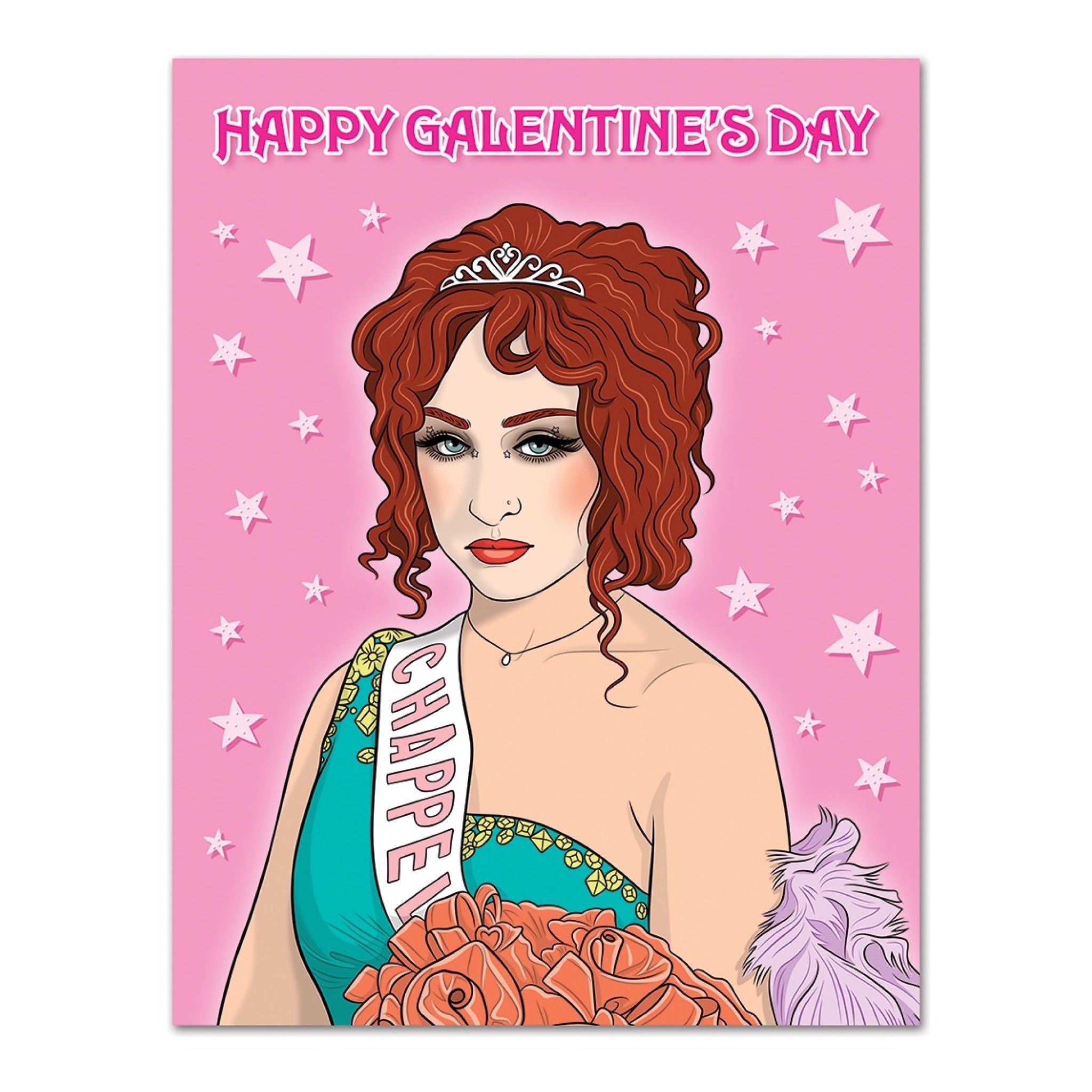 A bright, pop star inspired Galentine’s Day card featuring a glamorous pageant style portrait and big pink energy. Perfect for besties who love a little drama, a lot of sparkle, and a message that sings.
