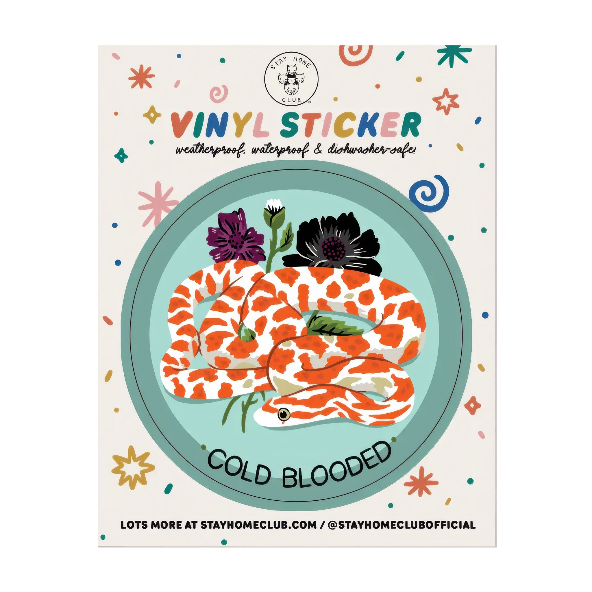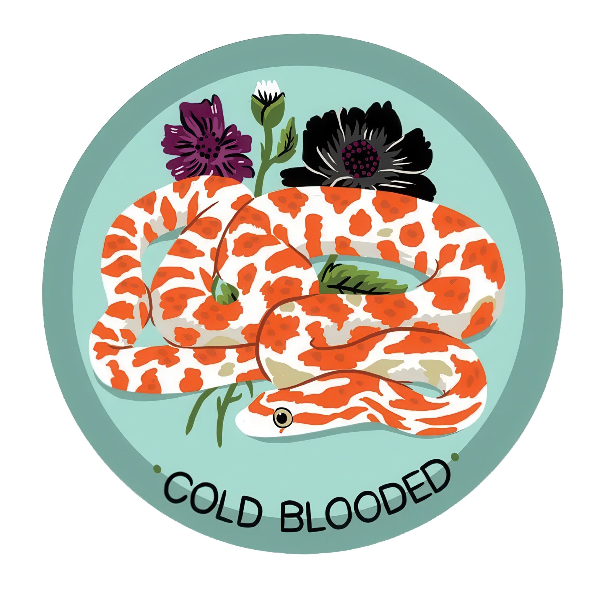 A cheeky “cold blooded” vinyl sticker featuring a dreamy snake and floral details. A fun pick for water bottles, laptops, and anyone with a little reptile energy.