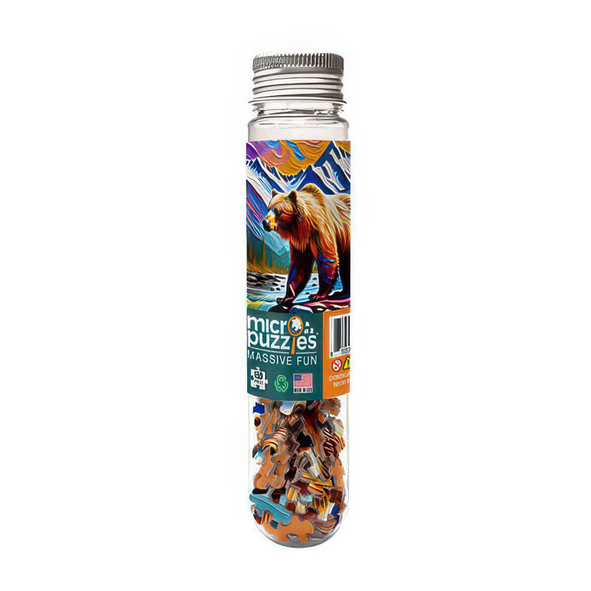 Piece together a vibrant Grizzly bear by a mountain stream, surrounded by trees and painted in bold, multicoloured wilderness tones.