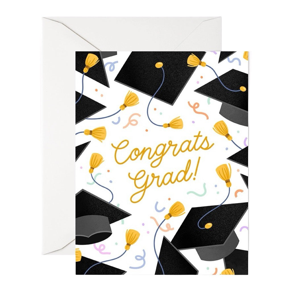 A fun graduation card bursting with caps, tassels, and confetti, ready to cheer on the new grad. Blank inside for proud messages and big plans.