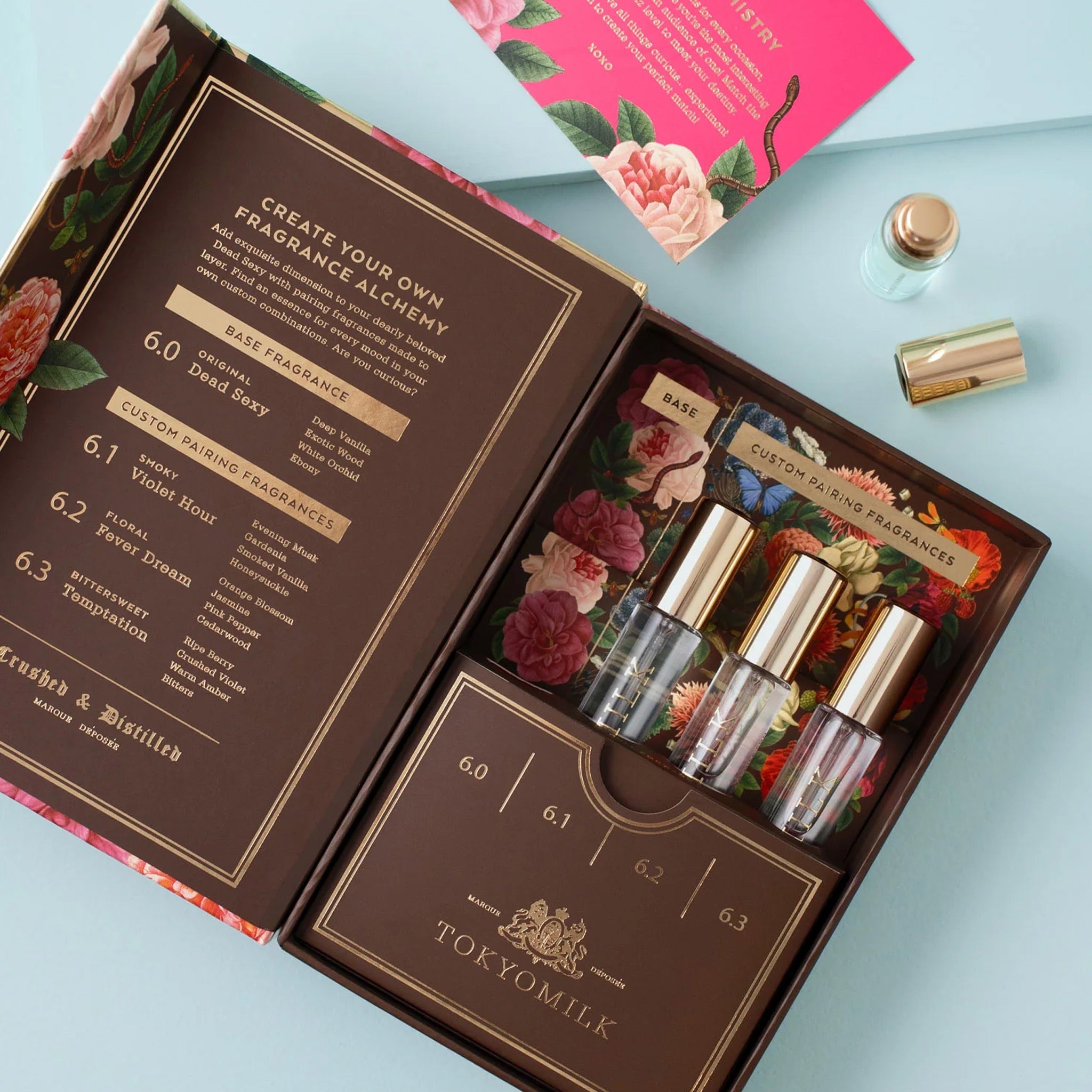 Dead Sexy layering kit is a mix-and-match fragrance playground with four eau de parfum spray vials, including the classic Dead Sexy plus three complementary scents. Wear each alone or layer them to create a custom blend, with a handy formulation card for pairing ideas, all tucked into a keepsake gilt box.