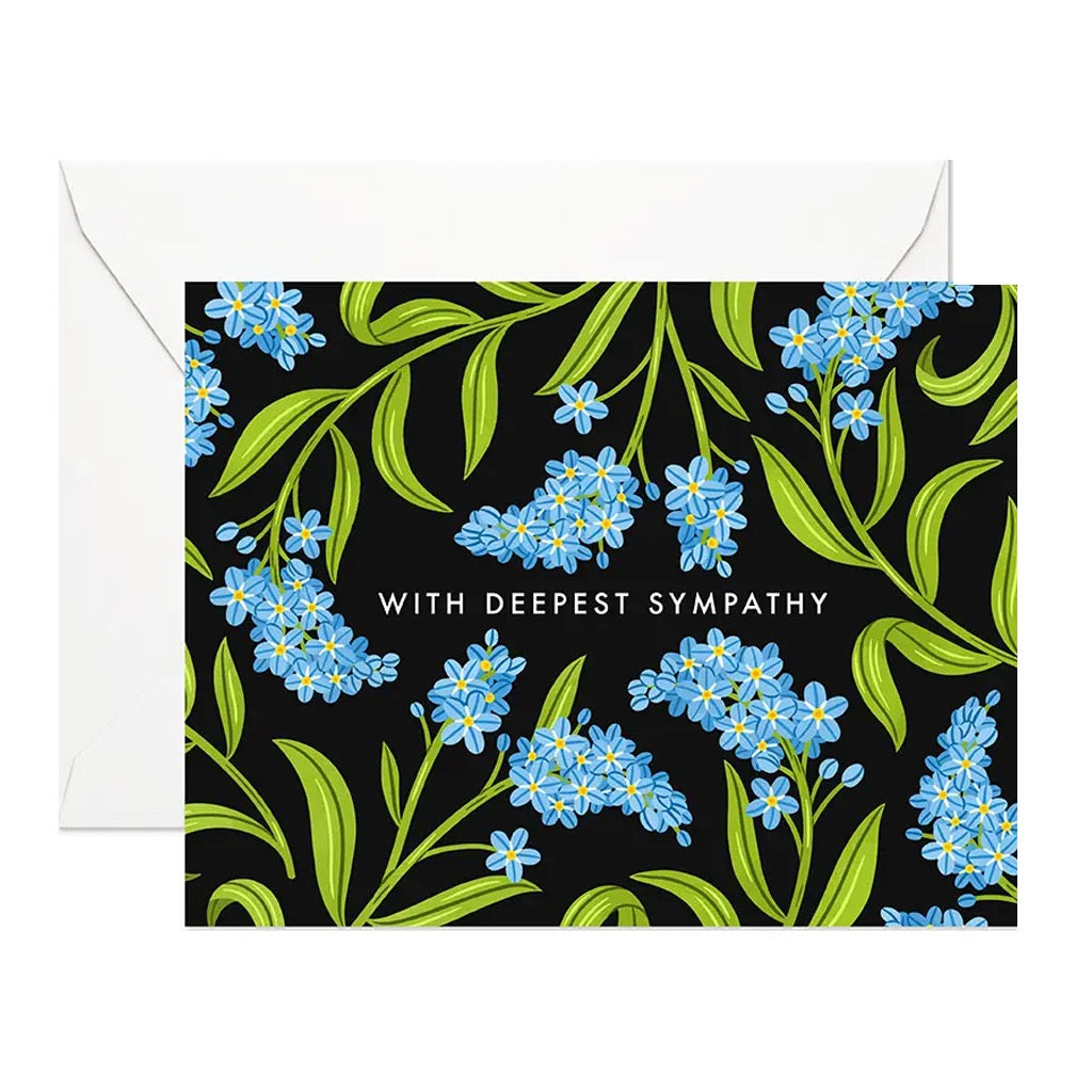 This deepest sympathy forget me not card features calming blue blooms on a dark background, offering a gentle way to share care and condolences.