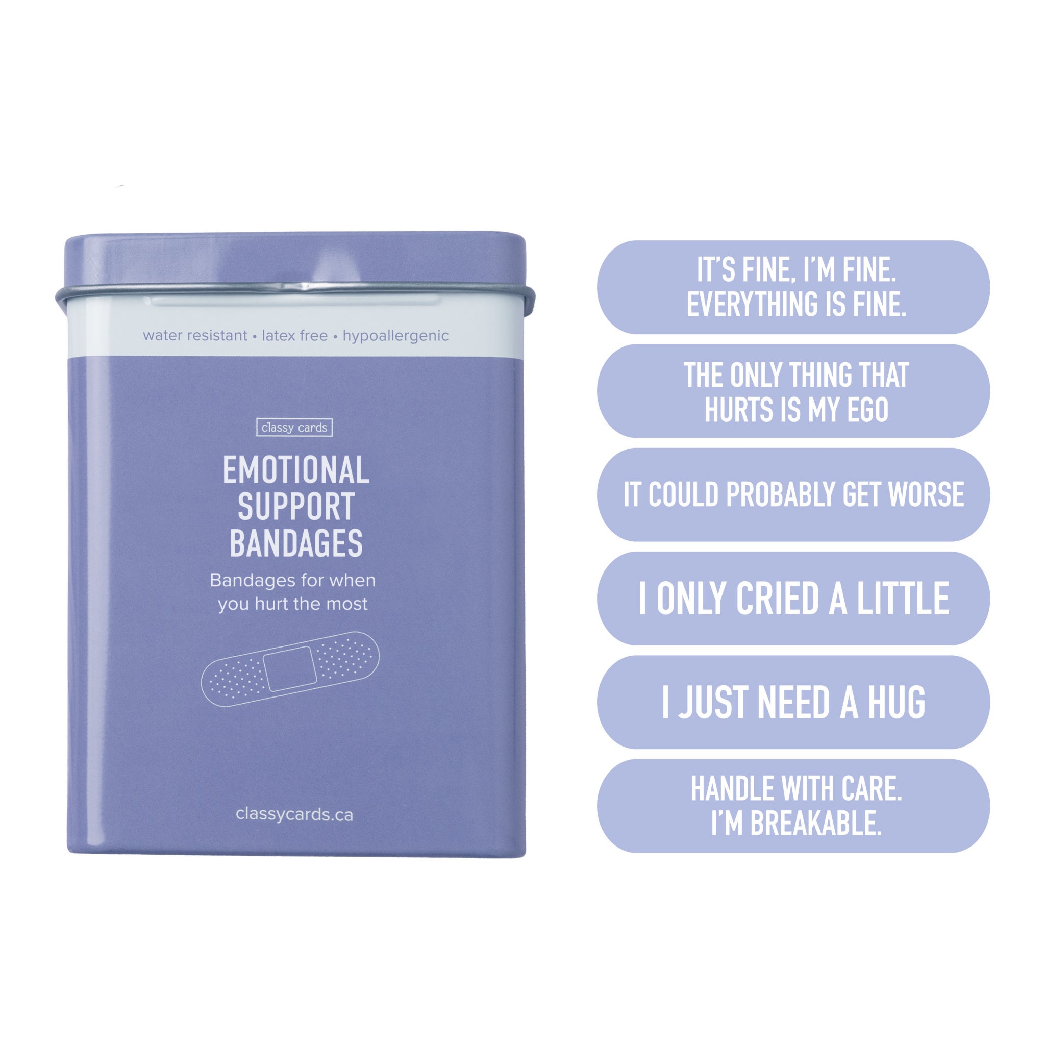 Bring a little humor to life’s minor disasters with these emotional support bandages. Each reusable tin includes 24 water resistant, hypoallergenic, latex-free bandages with laugh-worthy sayings for when you need a quick fix and a grin.