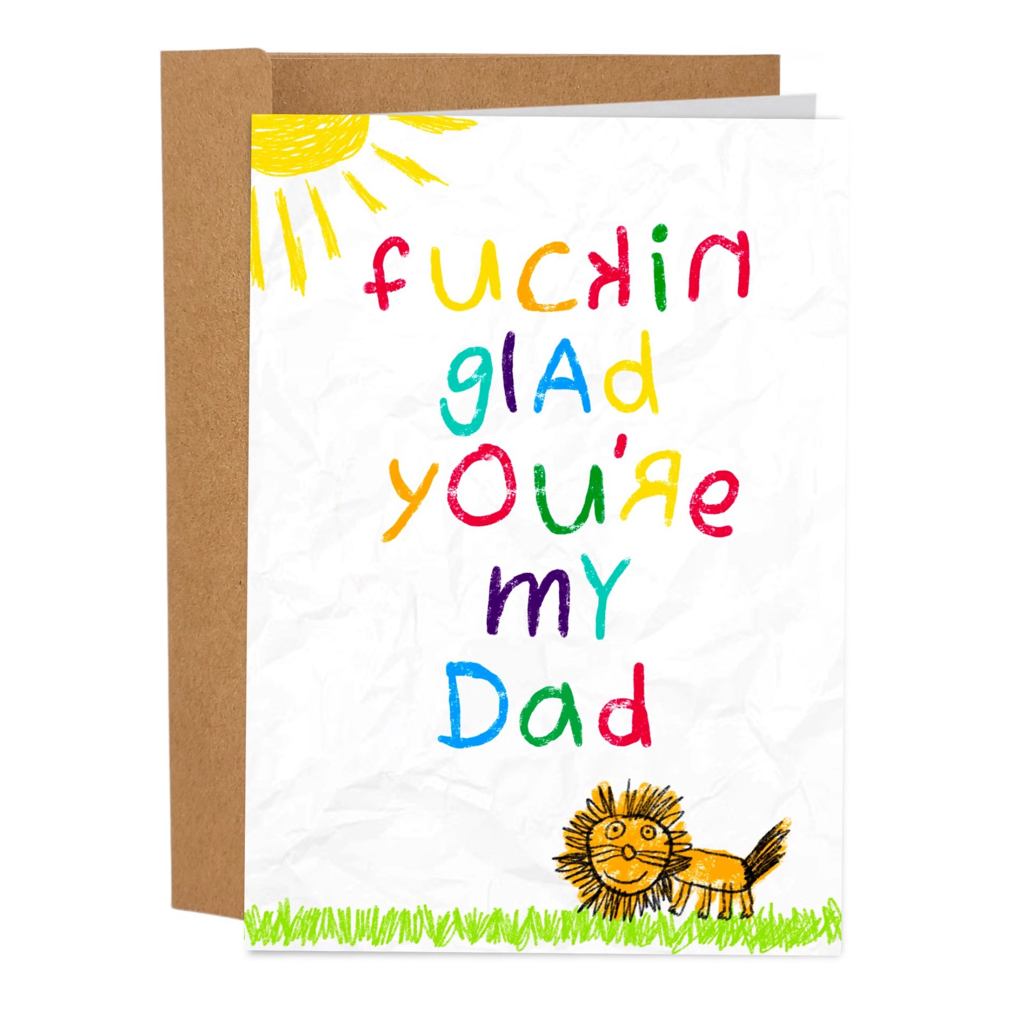 A cheeky Father’s Day card with bright, kid-style artwork and the message “Fucking glad you’re my dad.” Blank inside so you can keep it sweet, sentimental, or just as bold.