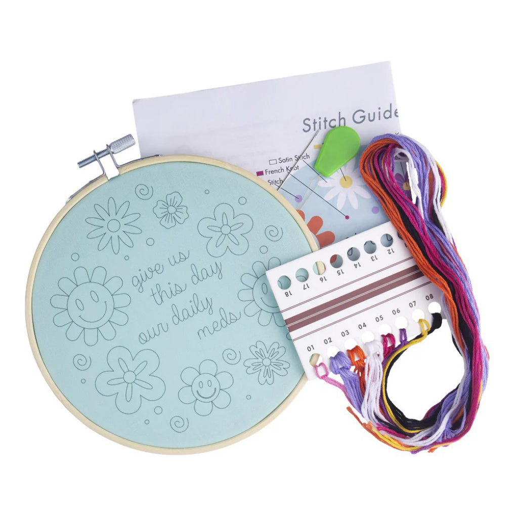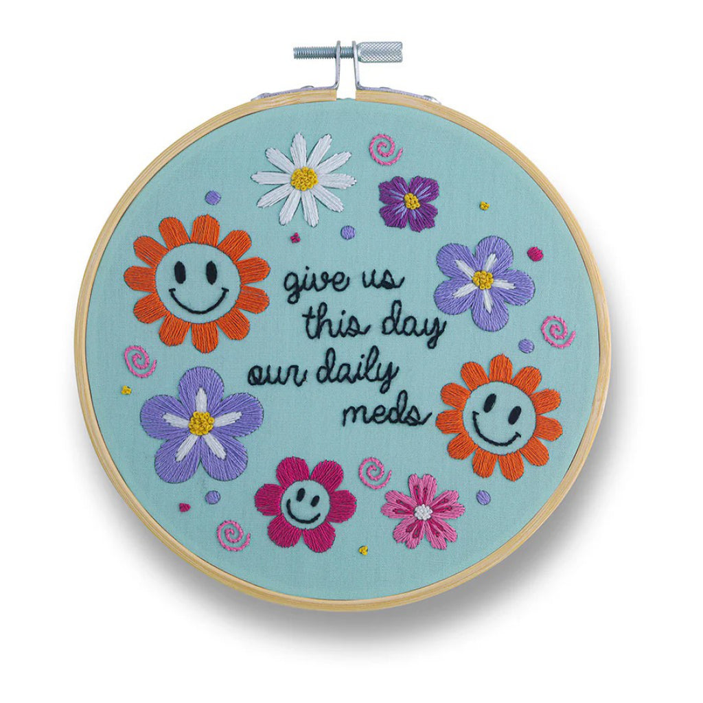 Give your stitching session a little serotonin boost with the Give Us This Day Our Daily Meds embroidery kit found in bright florals and happy-face energy.