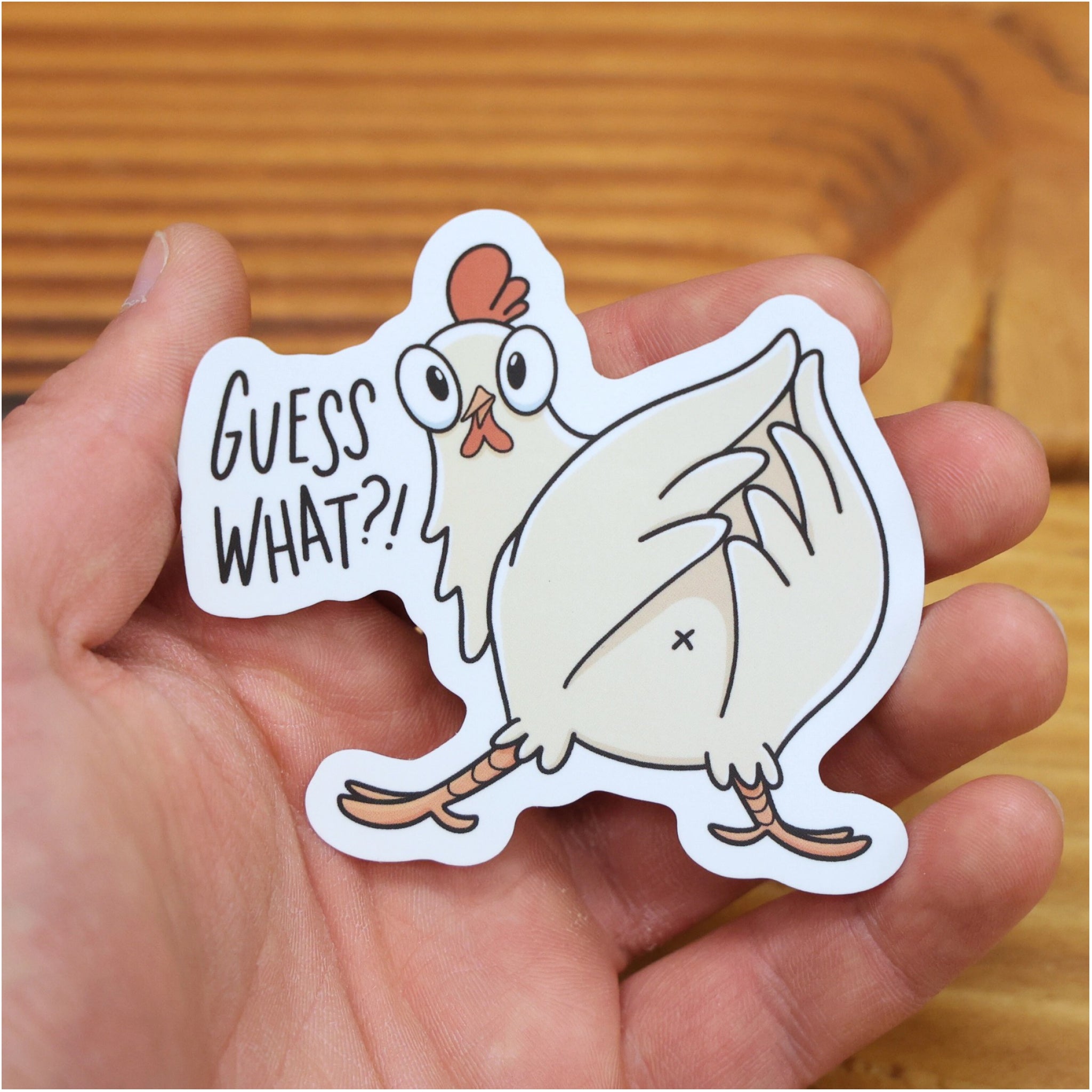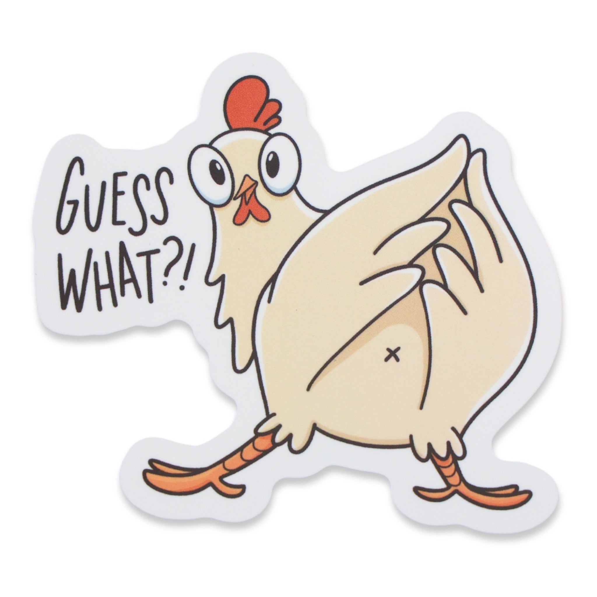 A cheeky “Guess what?!” chicken sticker that brings instant mischief to laptops, water bottles, and notebooks. Made from durable vinyl for everyday sticking and outdoor adventures.