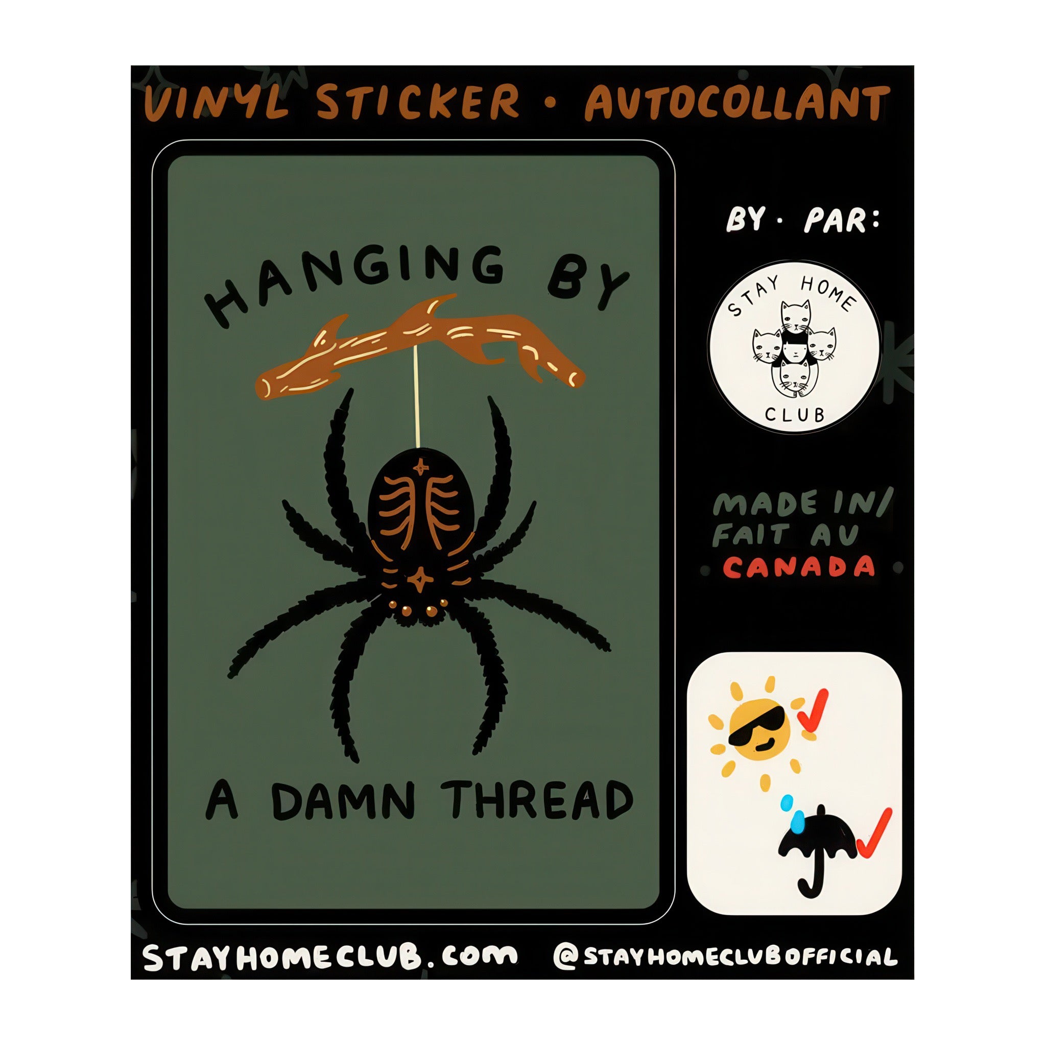 A darkly funny vinyl sticker featuring a dangling spider and the phrase “Hanging by a damn thread.” Relatable, spooky, and perfectly unhinged.