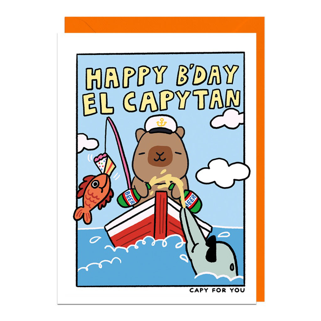 Wish them a fin-tastic birthday with this playful capybara captain card.