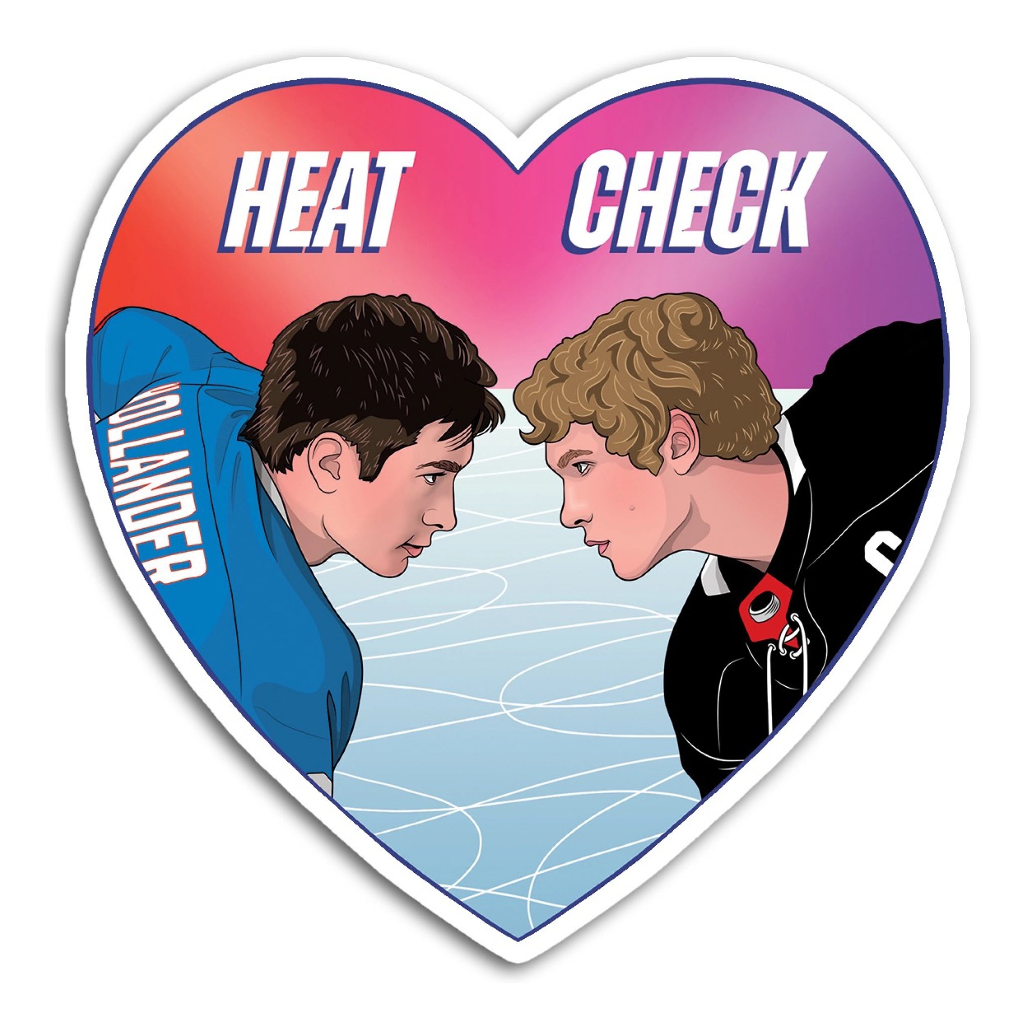 A heart shaped die cut sticker with hockey rivalry energy and a bold heat check faceoff. Thick, durable vinyl is made to handle daily wear on laptops, bottles, and more.