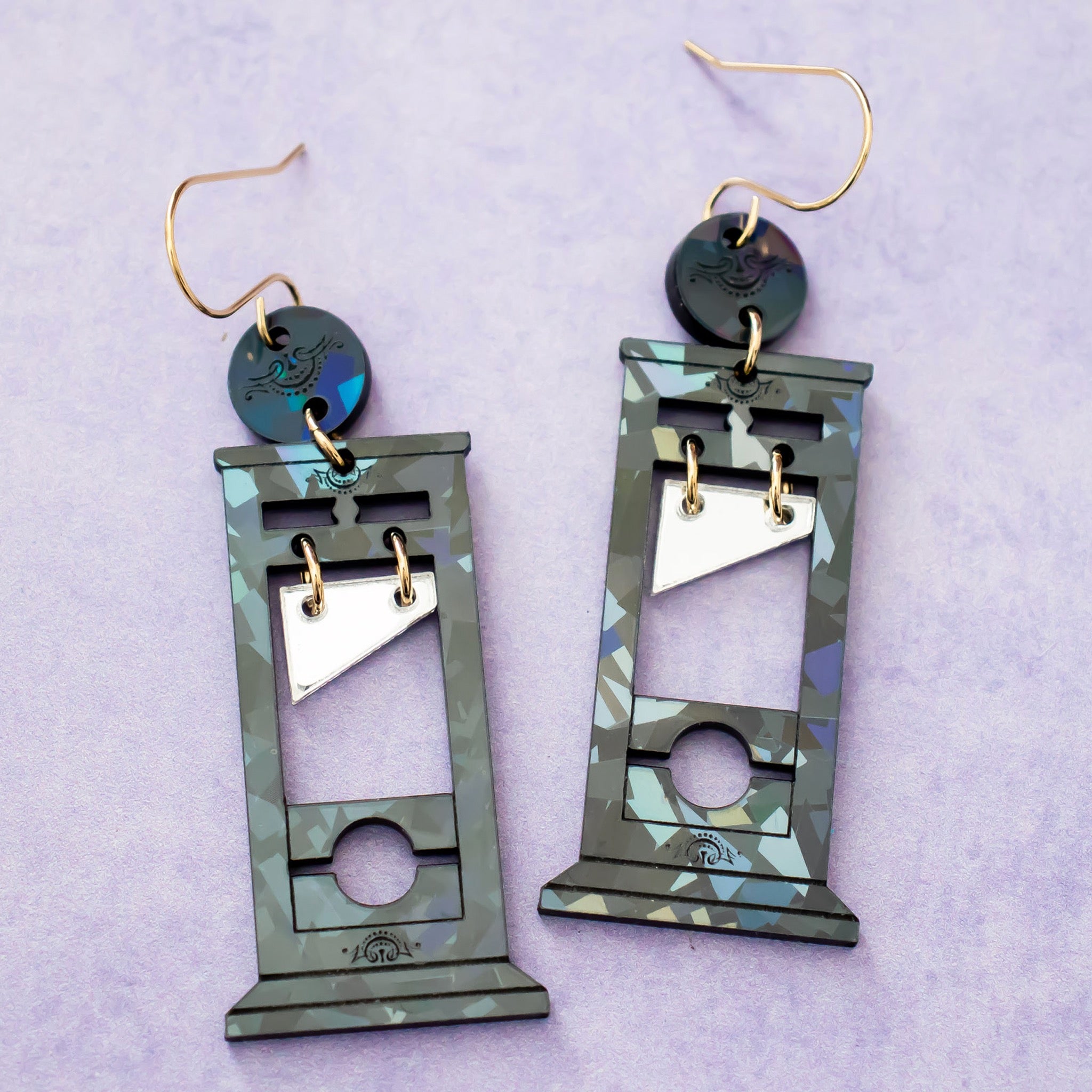 Delightfully dark with a sharp sense of humour. These black holographic guillotine earrings shimmer with subtle colour shifts and crisp engraved details, delivering spooky statement style without the weight.