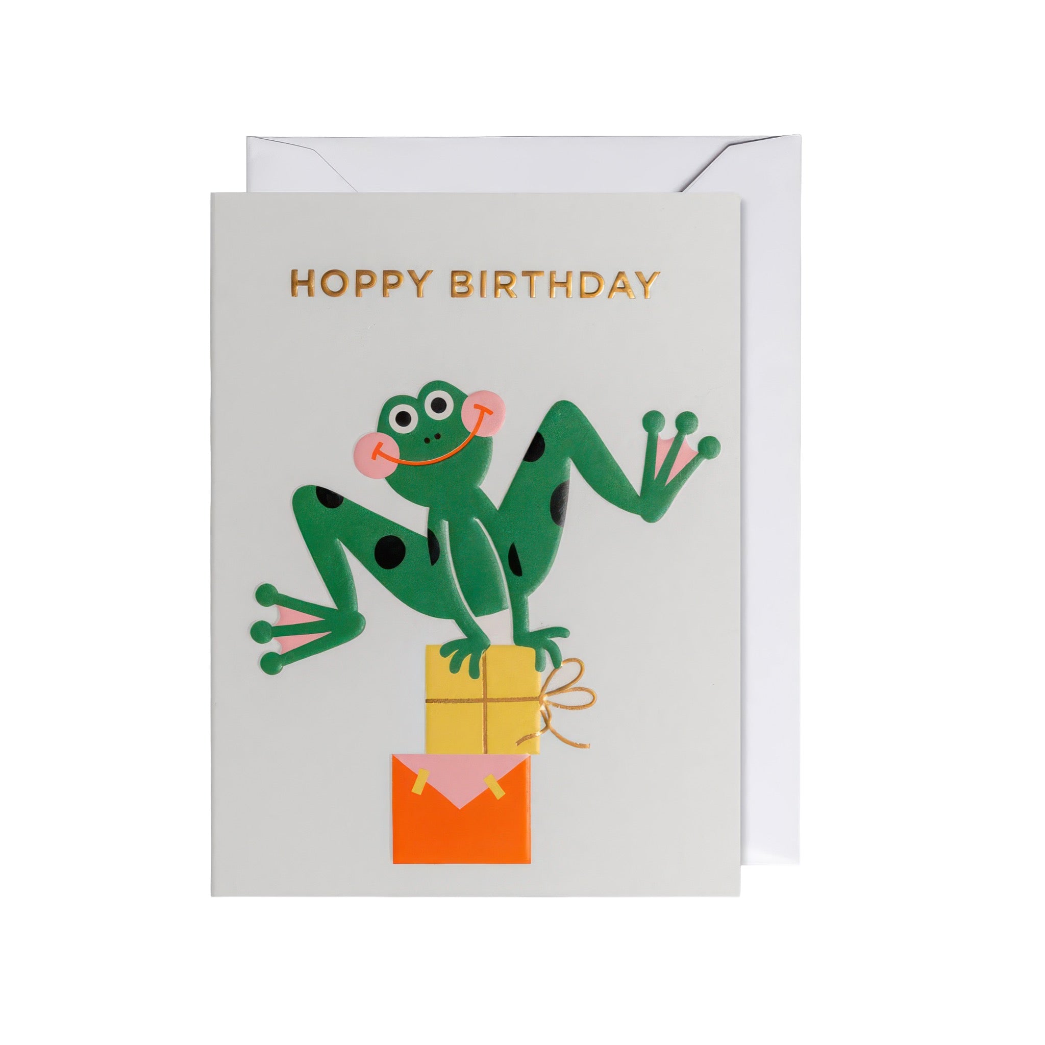 Send a little leap of joy with this cheerful mini birthday card. Featuring a playful frog and gold “Hoppy Birthday” lettering, it is printed on accredited sustainable and recycled papers with vegetable based inks and blank inside for your note.