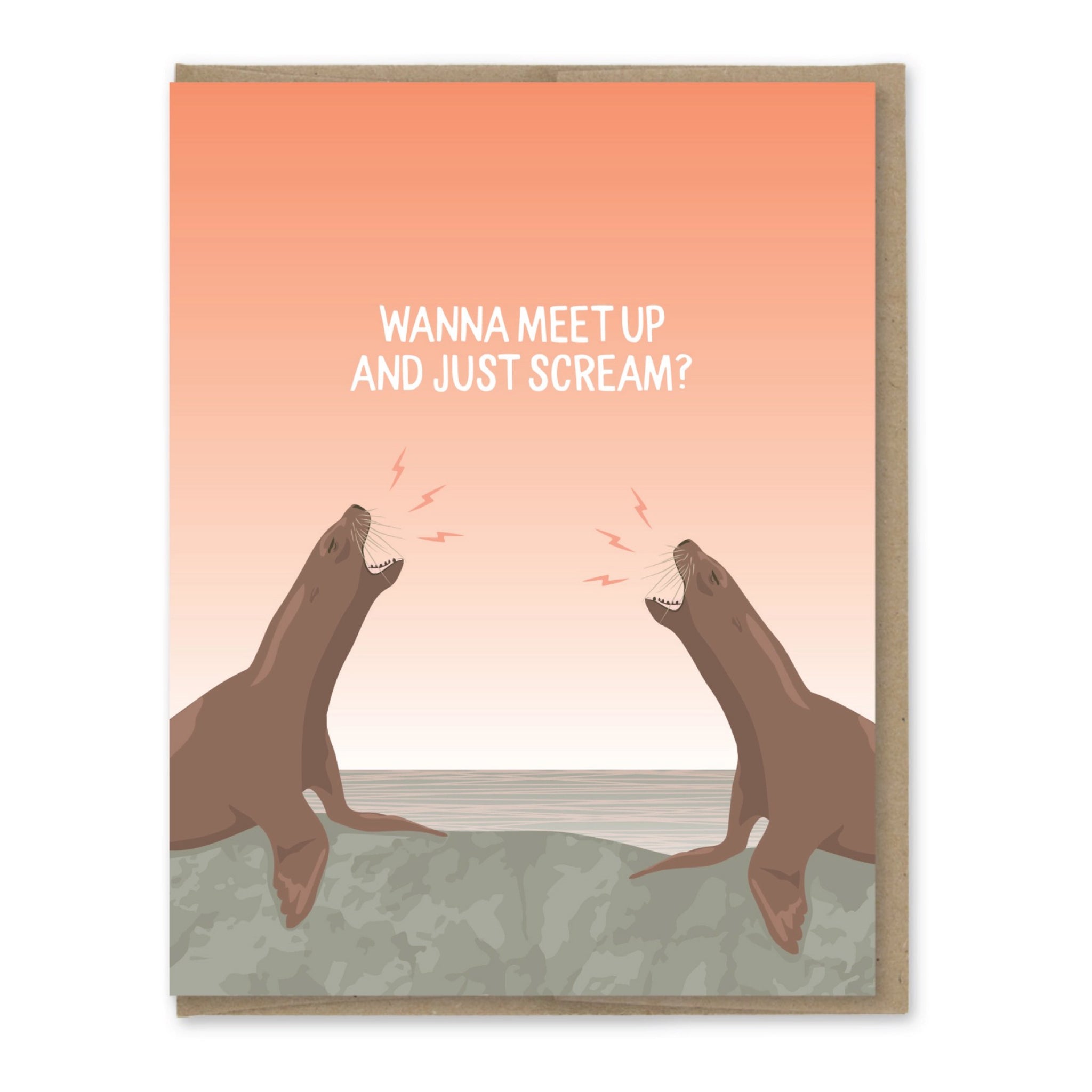 A funny encouragement card featuring two sea lions mid-yell and the message “Wanna meet up and just scream?” Perfect for stressy days and solidarity laughs.