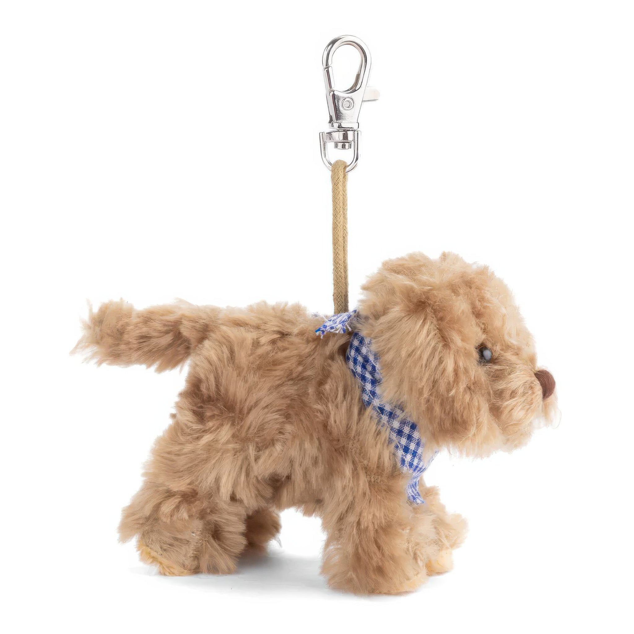 Meet Kharma puppy bag charm, a tan pup with a sweet expression and soft plush texture. Wearing a blue checkered scarf, this adorable companion brings playful charm to handbags, backpacks or keys.