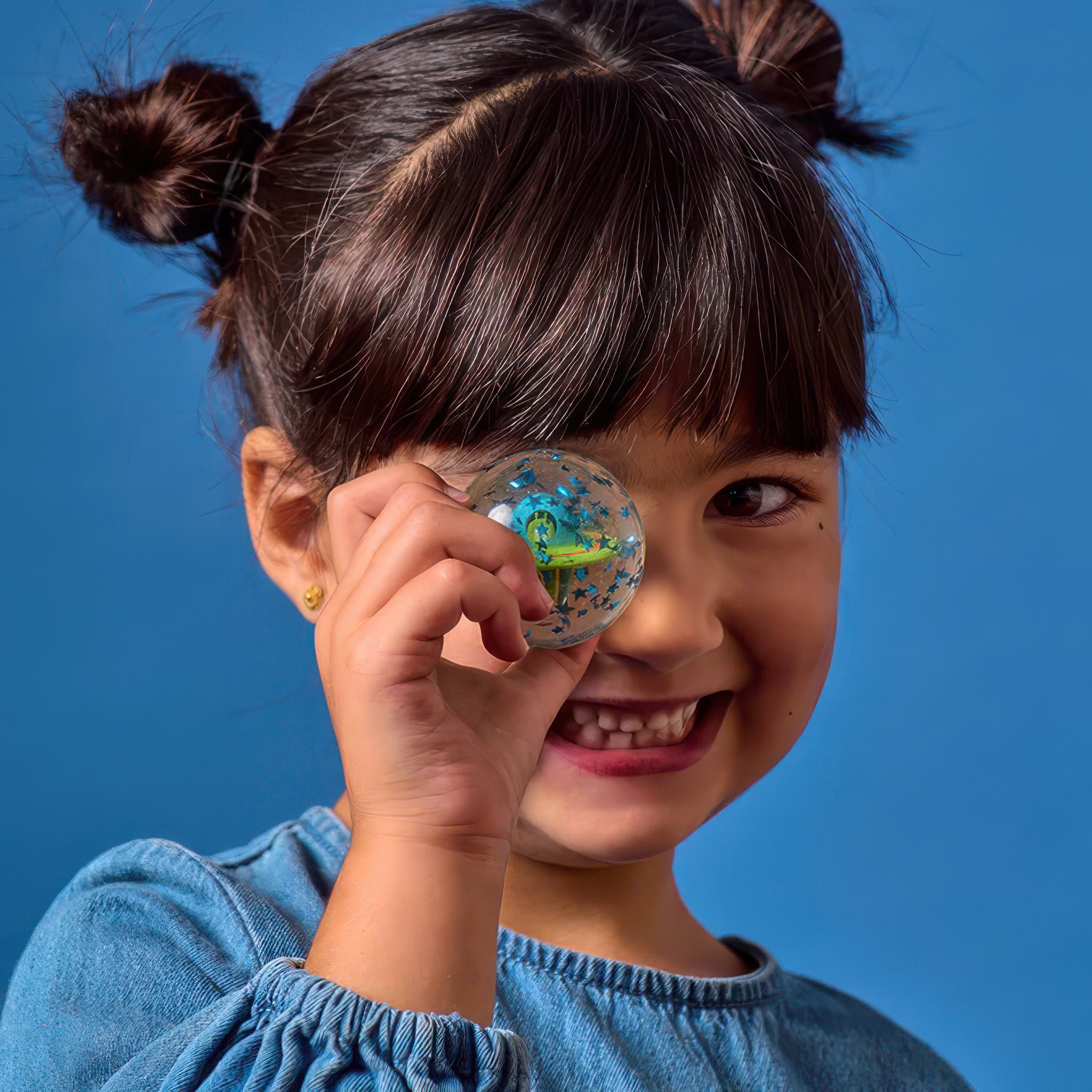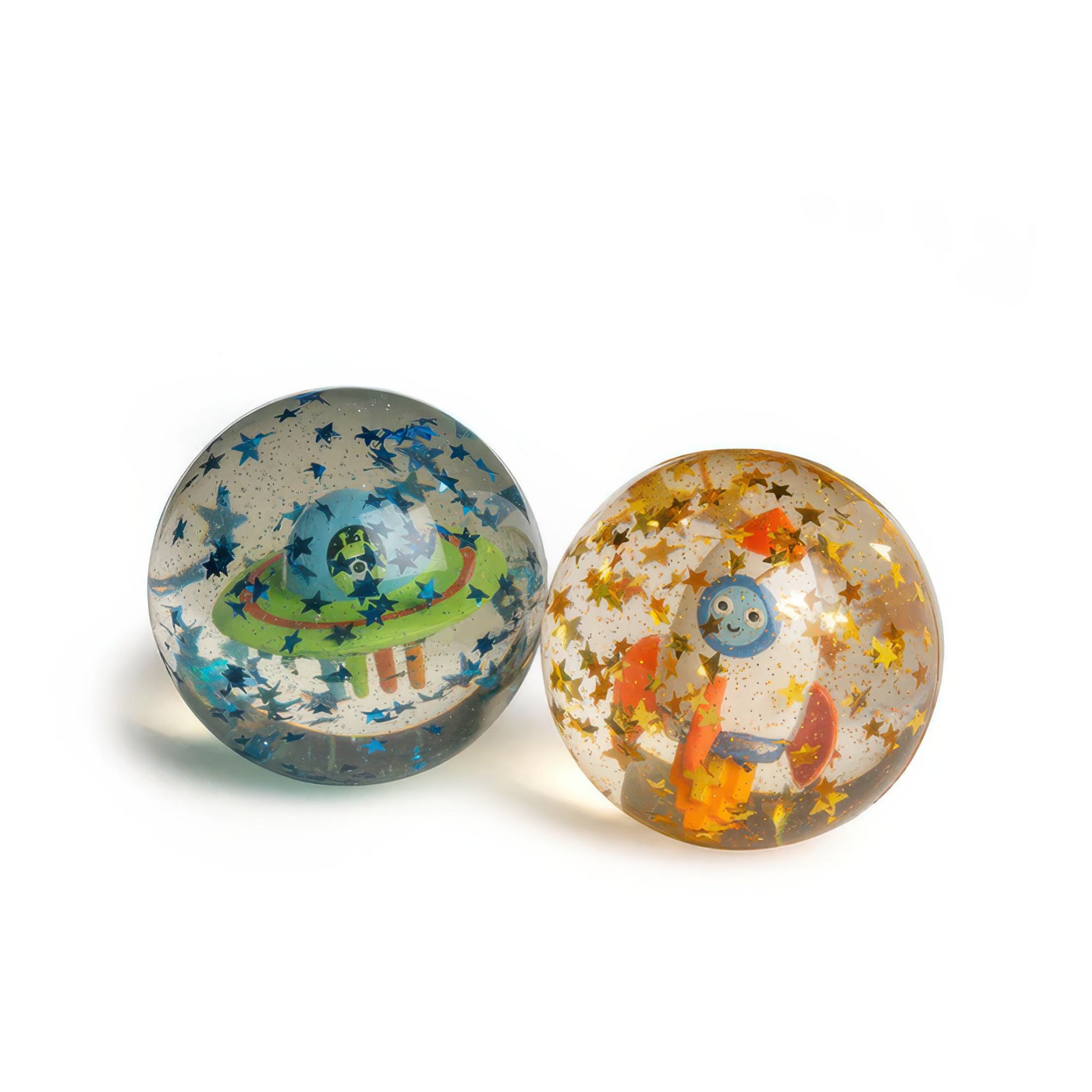 Blast off into playtime with a rocket ship or UFO bouncy ball. Packed with glittery space vibes, it bounces high for out of this world fun indoors or out.