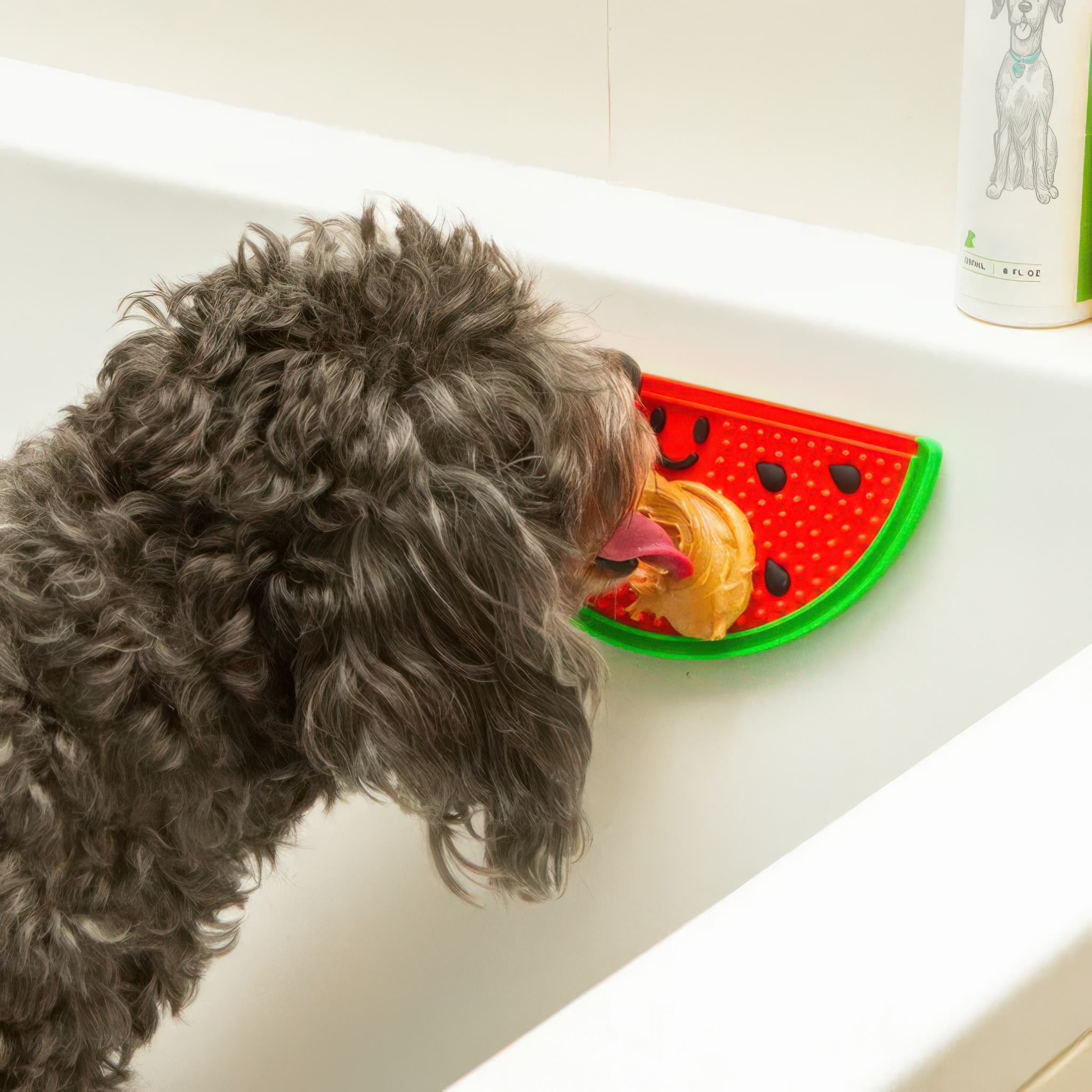 Make bath time sweeter with this playful watermelon lick mat. Spread on peanut butter, yogurt, or other dog safe treats and stick it to the wall or floor to keep pups happily distracted during grooming.