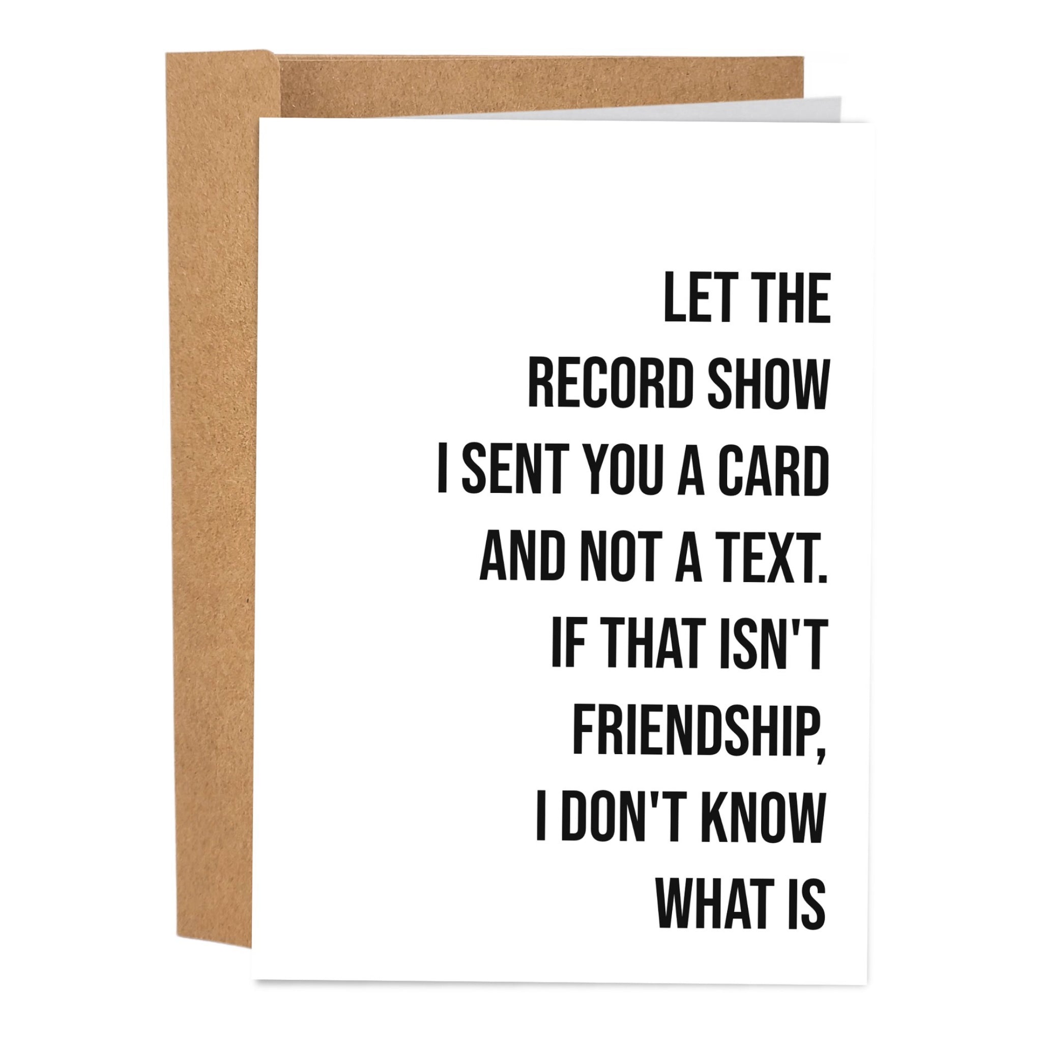 A funny birthday card for the friend who deserves more than a quick text, featuring the message “Let the record show I sent you a card and not a text.” Blank inside for your own note.