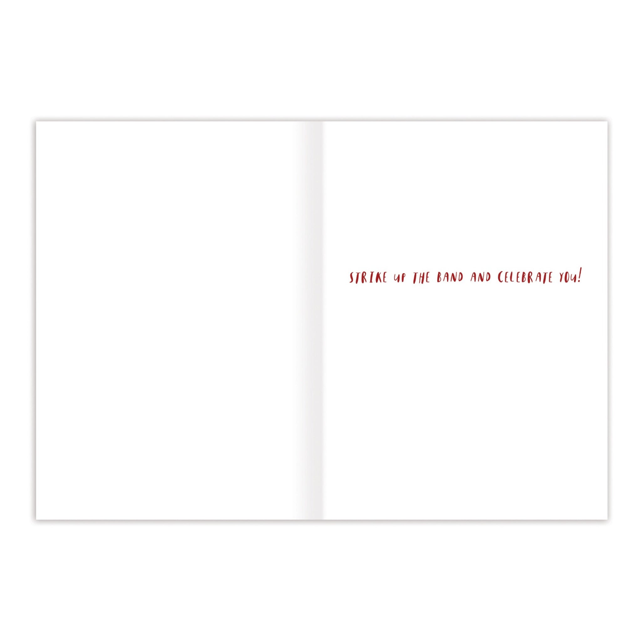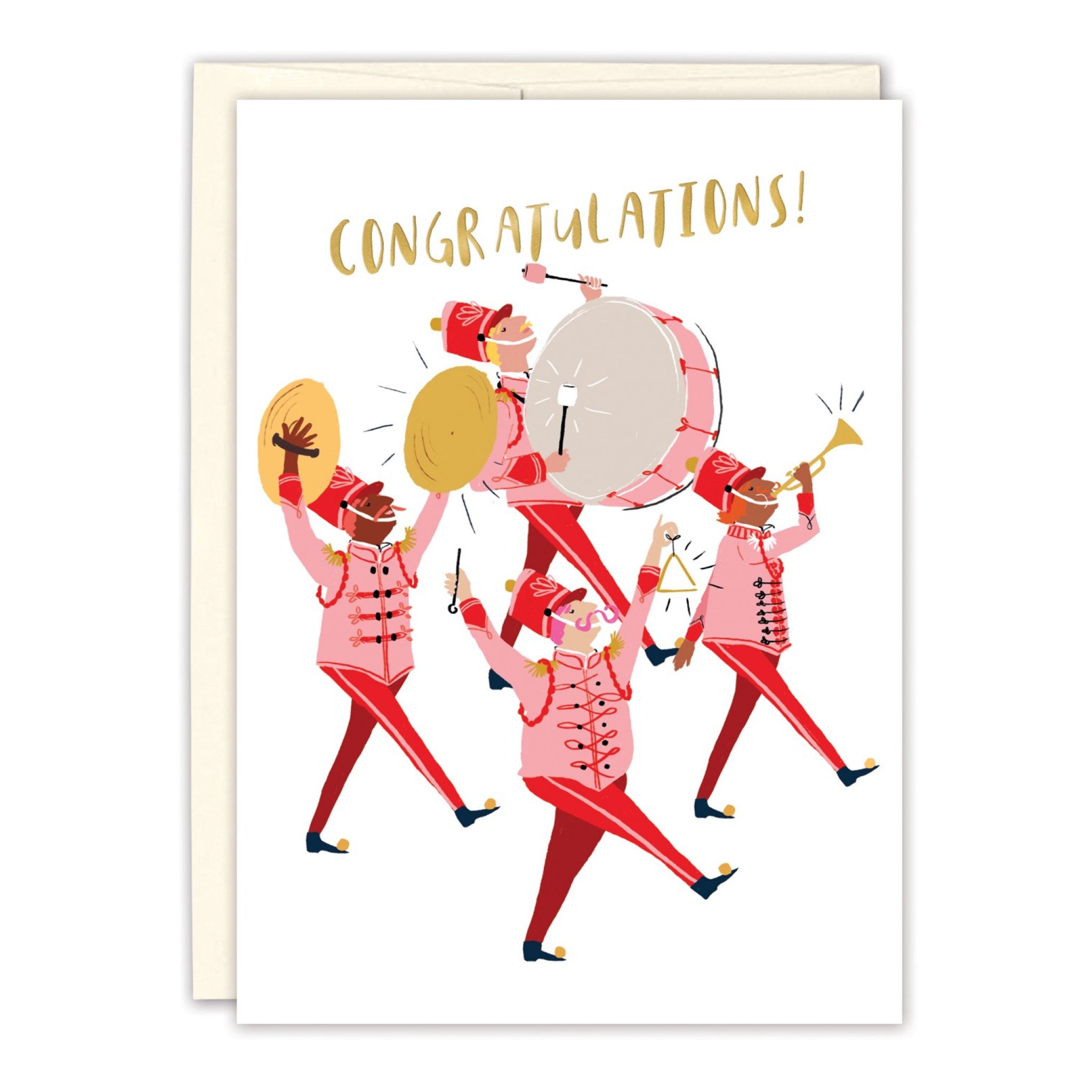 A celebratory congratulations card featuring a lively marching band and shimmering gold foil details. A joyful way to cheer on a big achievement.