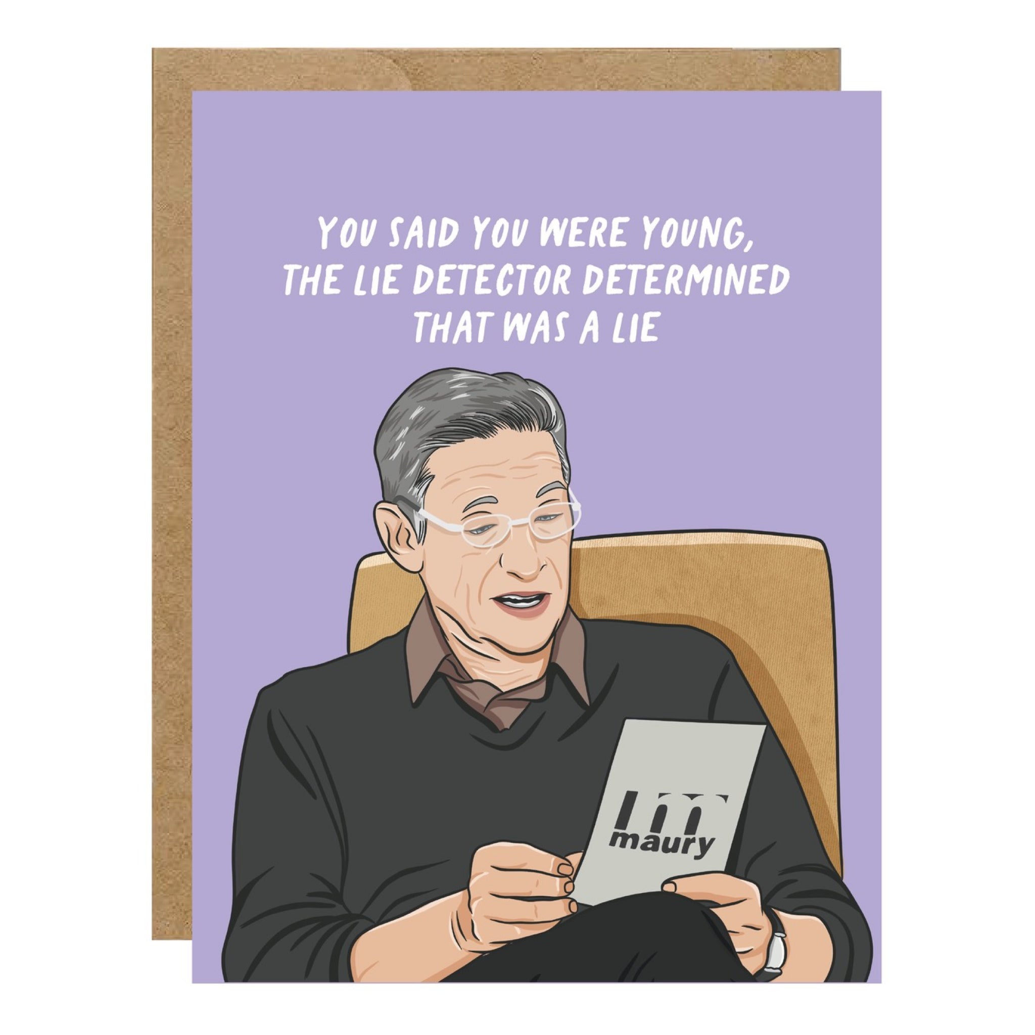 You said you were young. The lie detector determined that was a lie. This funny birthday card is blank inside, printed on white cardstock, and paired with a kraft envelope.