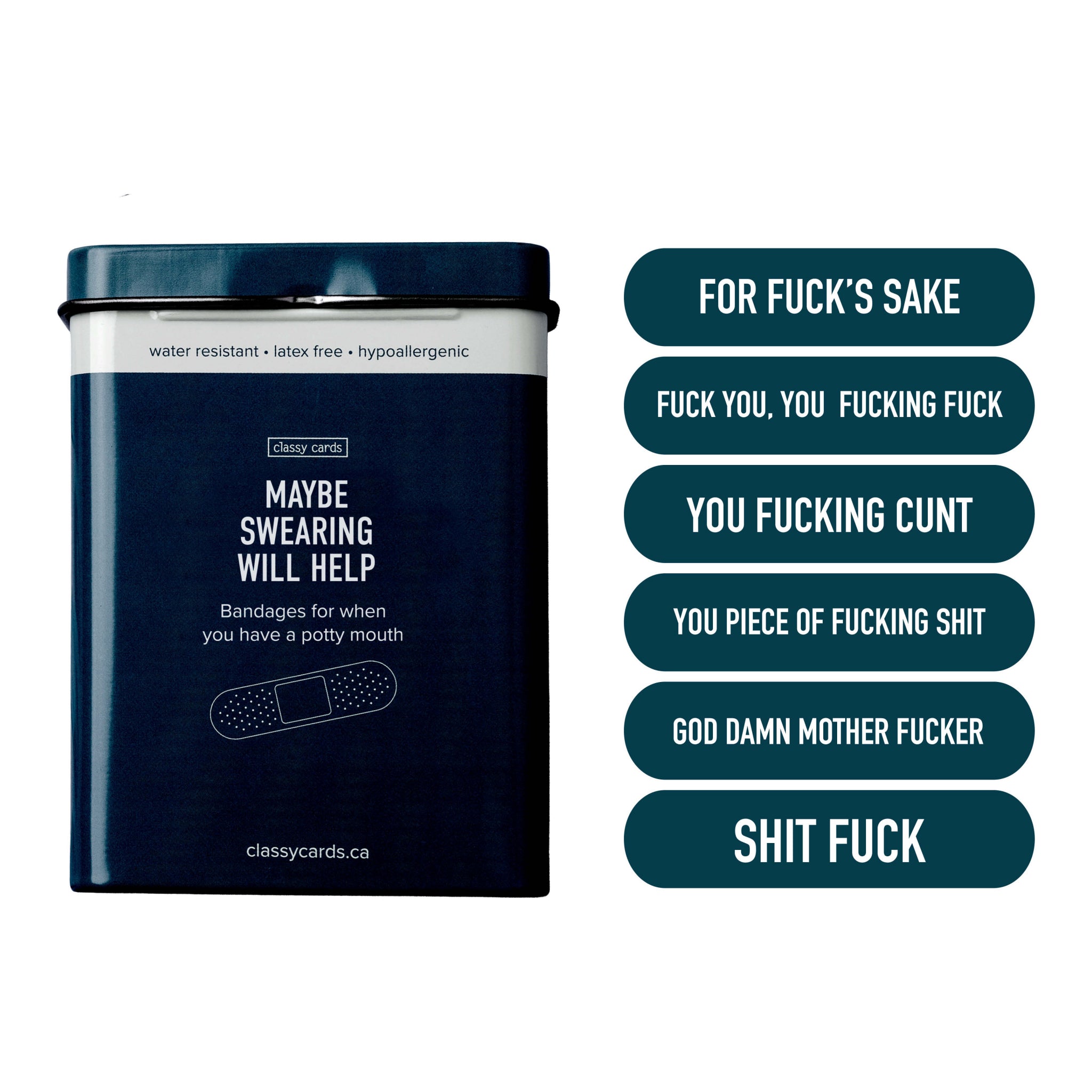 Add a little dark humour to minor mishaps with a tin of bandages made for potty mouths. This set includes water resistant bandages that are hypoallergenic and latex free.