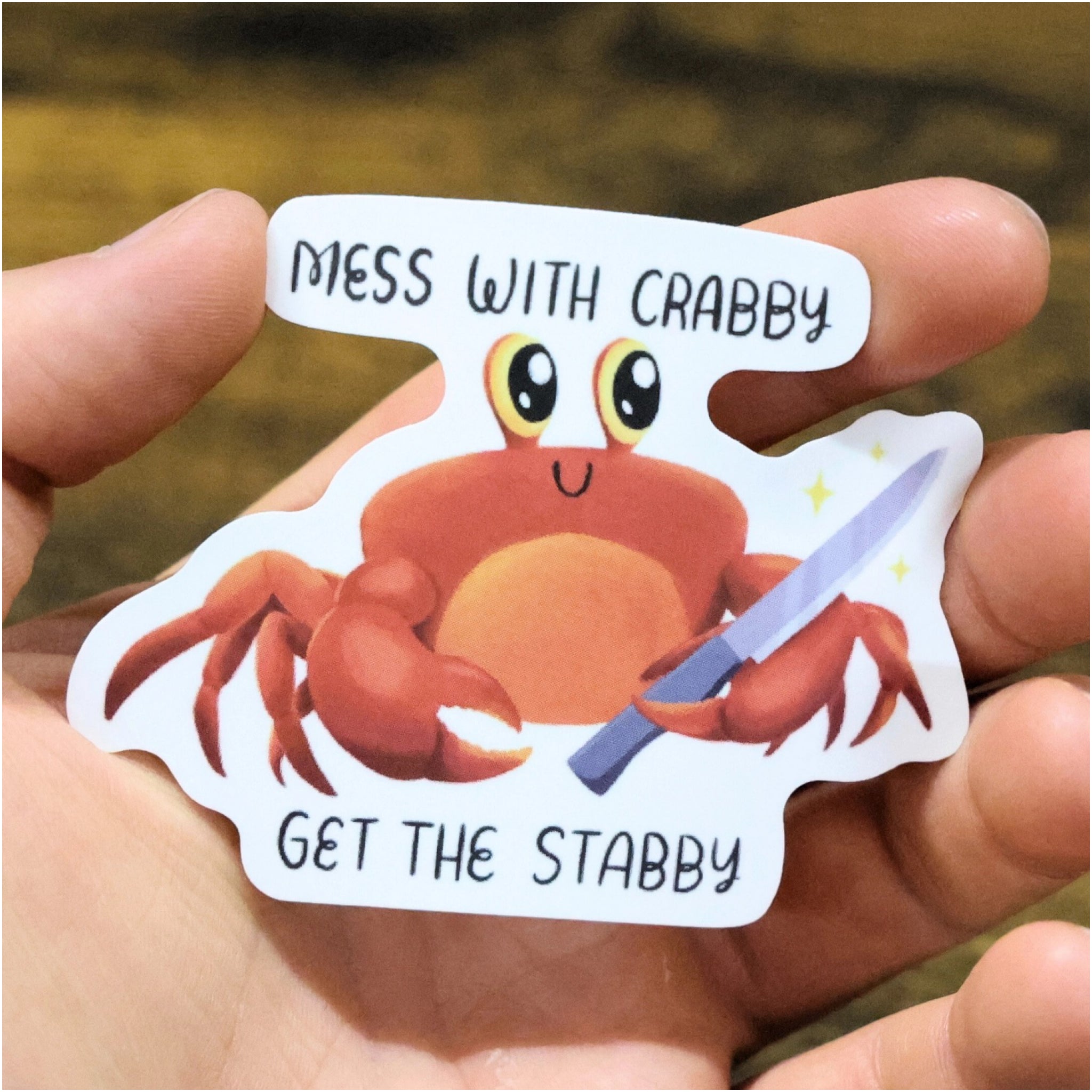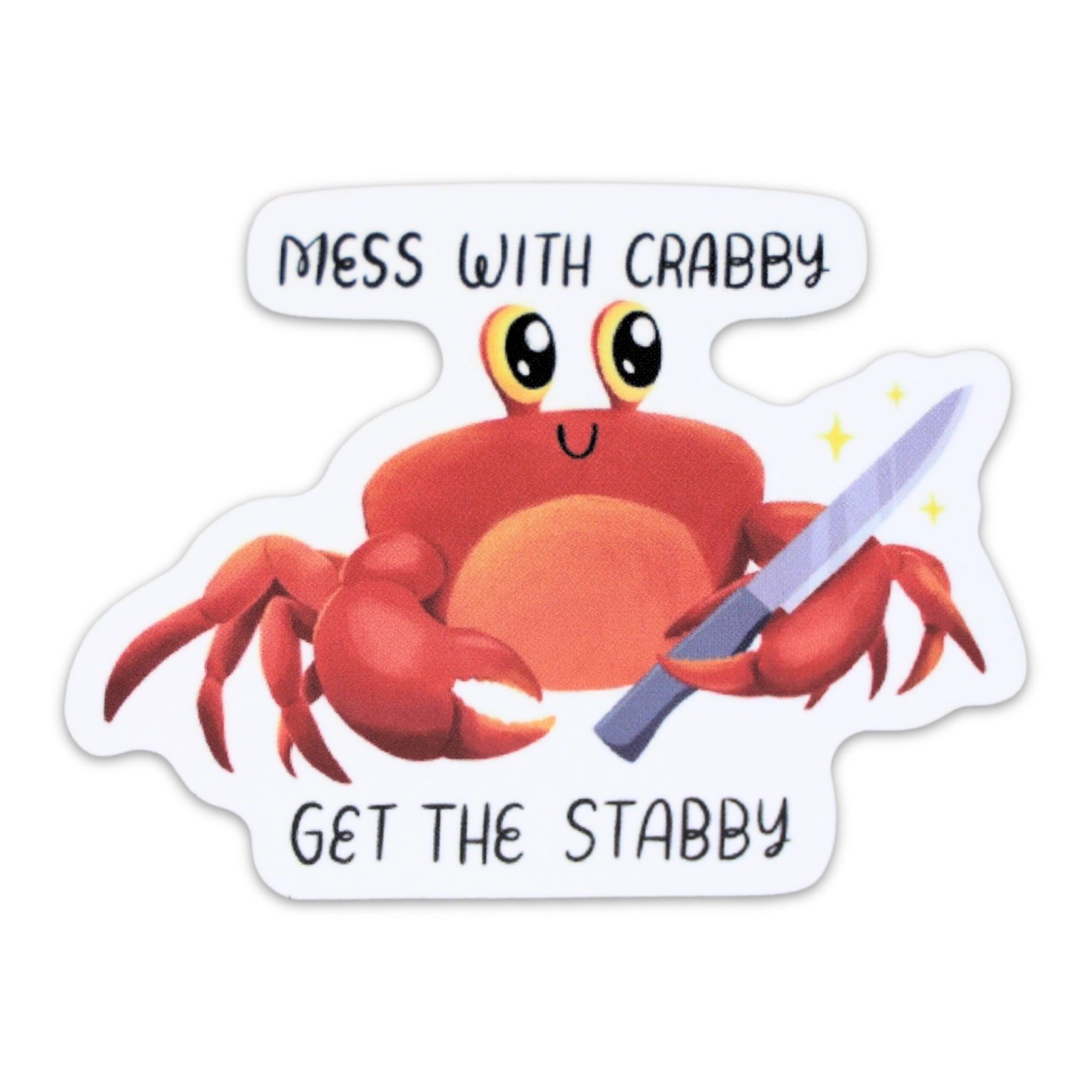 A sassy little crab with a warning: mess with Crabby, get the stabby. This playful vinyl sticker adds bold personality to laptops, water bottles, and more.