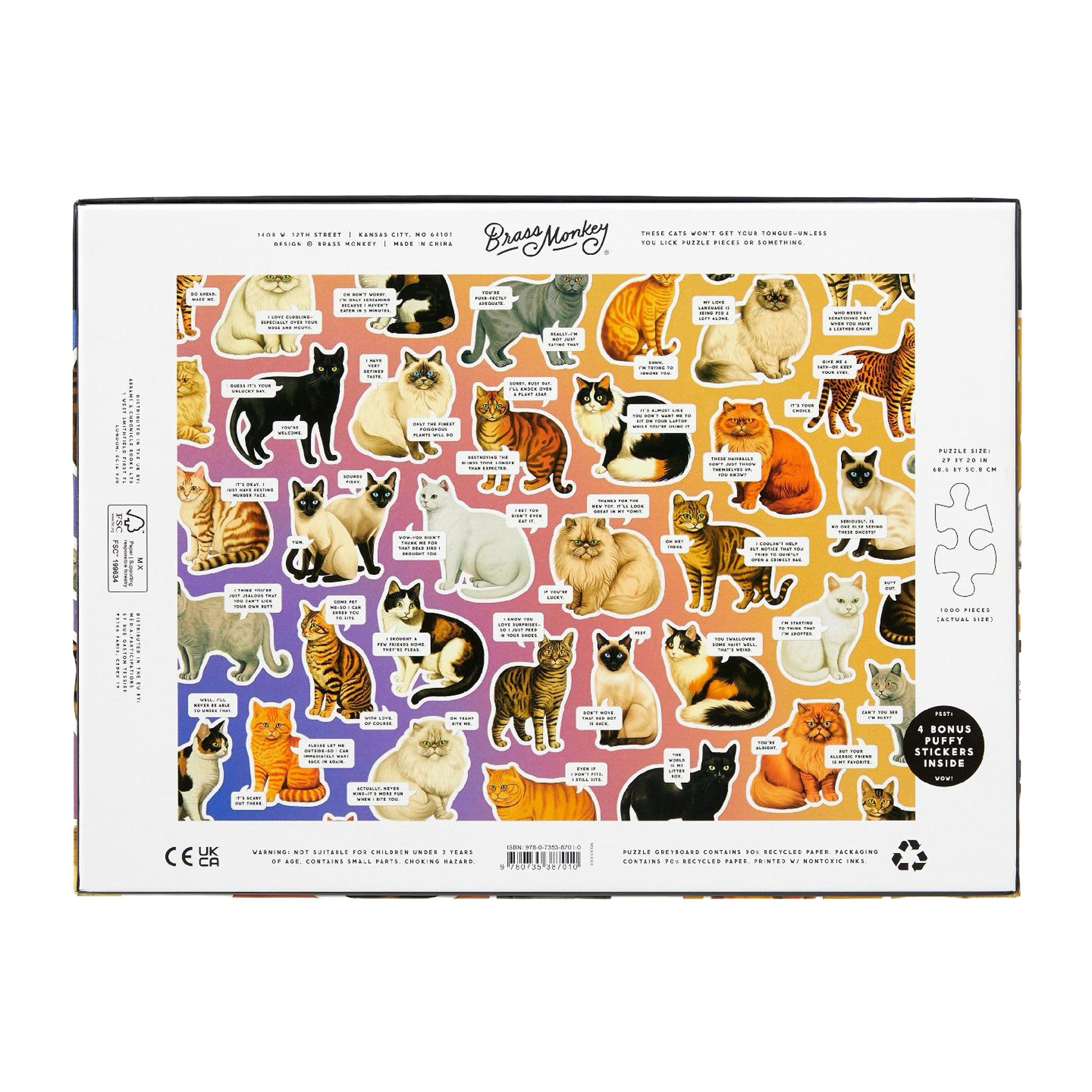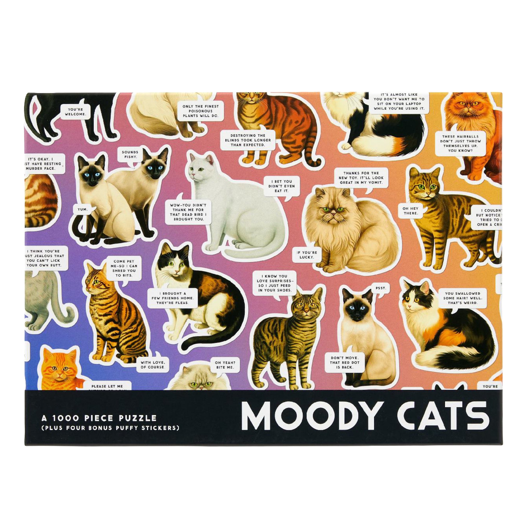 A 1,000-piece puzzle packed with dramatic cats and tiny speech bubbles, delivering maximum side-eye one piece at a time. Bright, bold, and hilariously judgmental, it’s the perfect project for cat people and puzzle people alike.