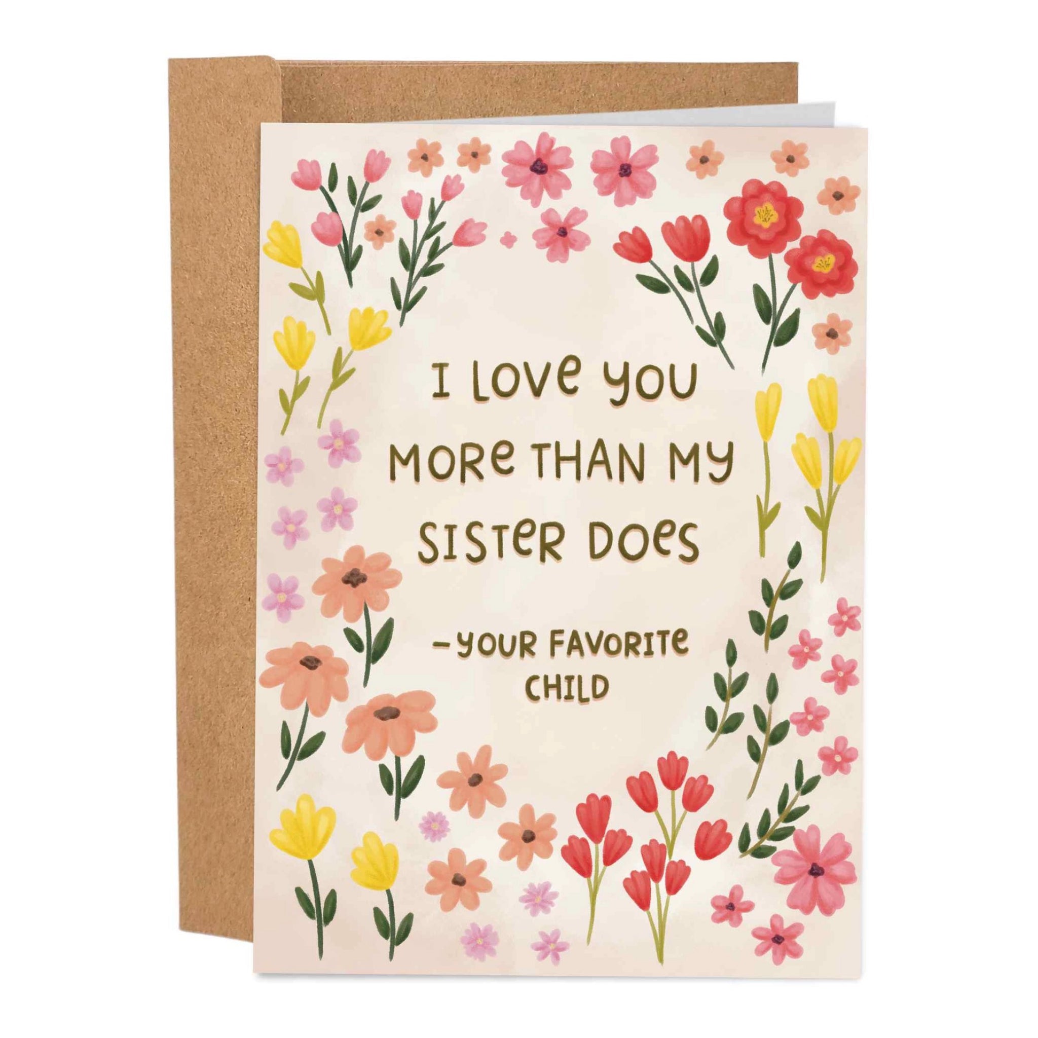 A sweet and funny Mother’s Day card with delicate florals and the message “I love you more than my sister does, your favorite child.” Blank inside for your own note.