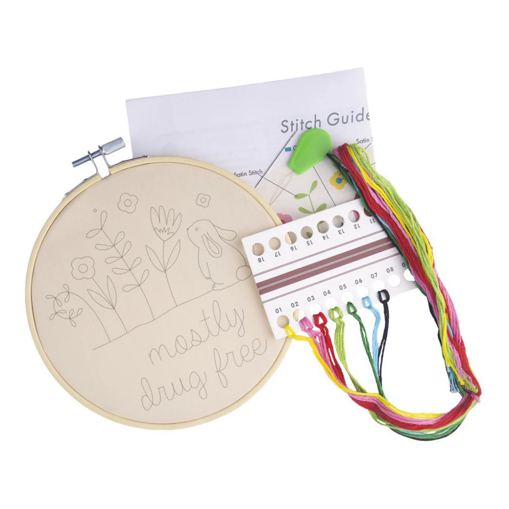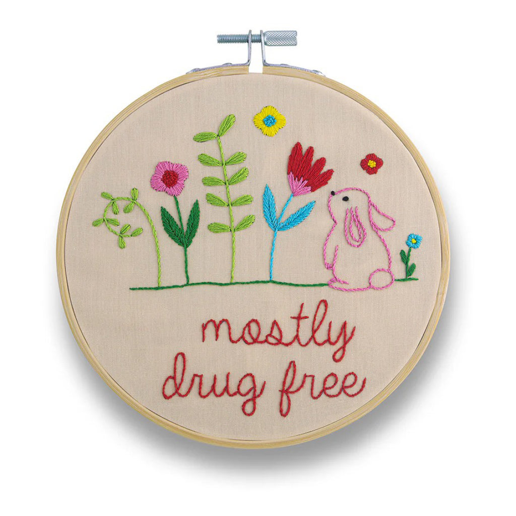A sweet little bunny, cheerful florals, and a message that keeps things honest. Mostly Drug Free is the kind of embroidery you hang up for the cute colours and keep up for the double takes.