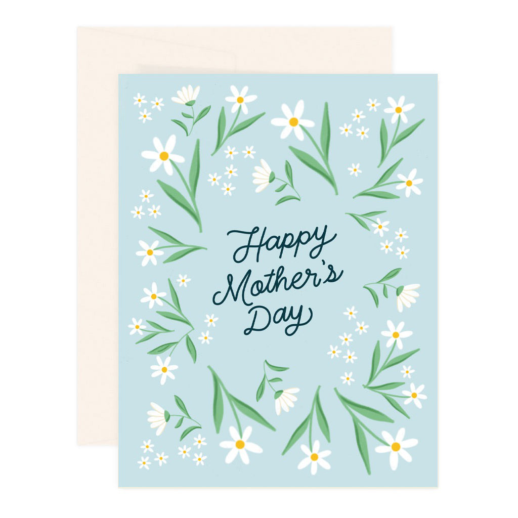 Celebrate her with this charming Mother’s Day card featuring a delicate daisy wreath and soft blue background. Printed on thick card stock and blank inside for your heartfelt message.