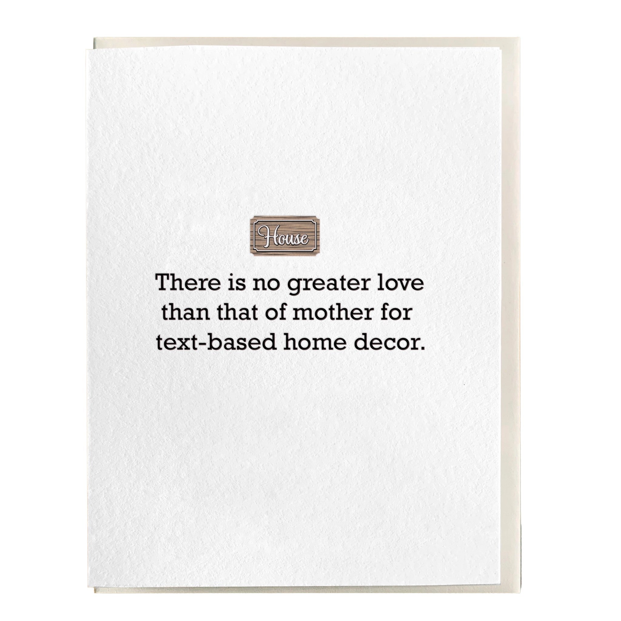 A cheeky letterpress card for the mom who can’t resist a good quote sign, featuring the message “There is no greater love than that of mother for text-based home decor.” Blank inside for whatever you want to add next.