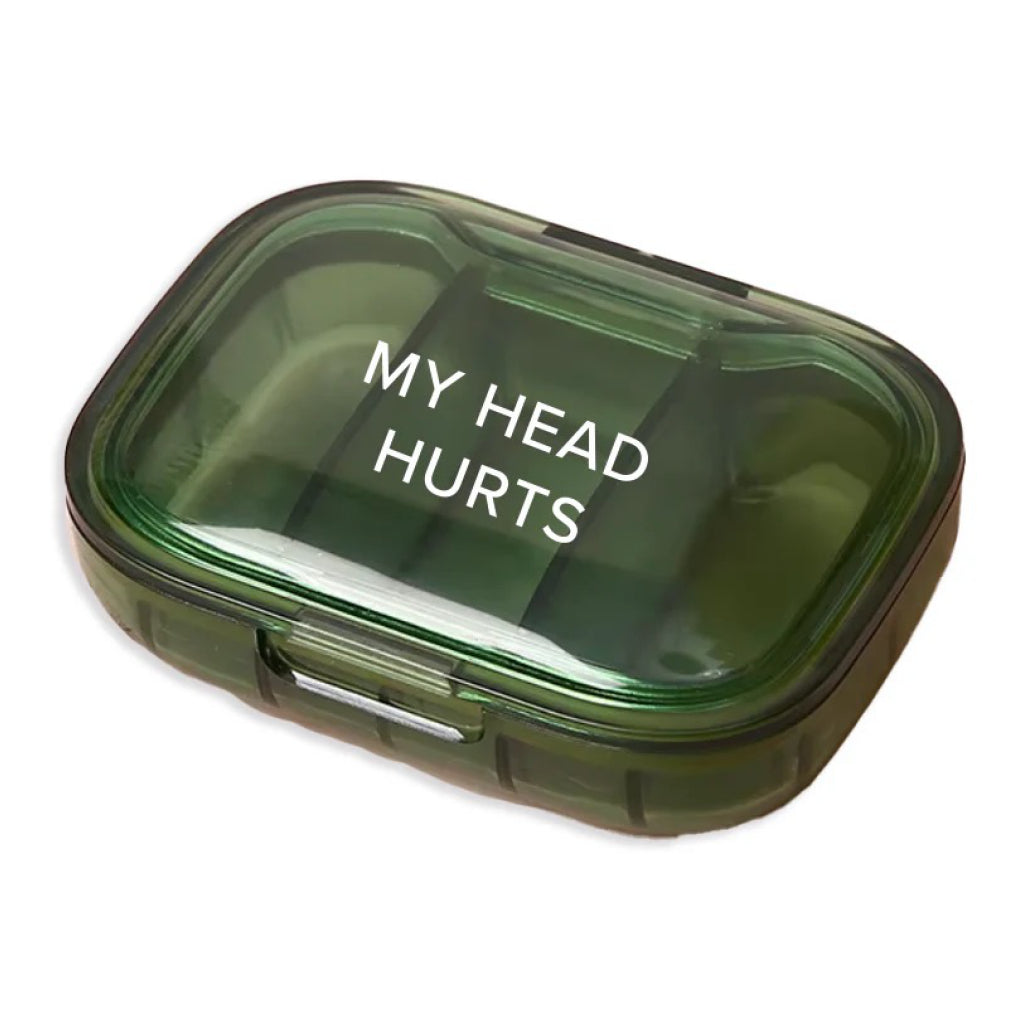 Tiny pill case, big attitude. This compact pill box features three compartments to keep medications organized and close at hand, with a bold “My head hurts” message on the lid.