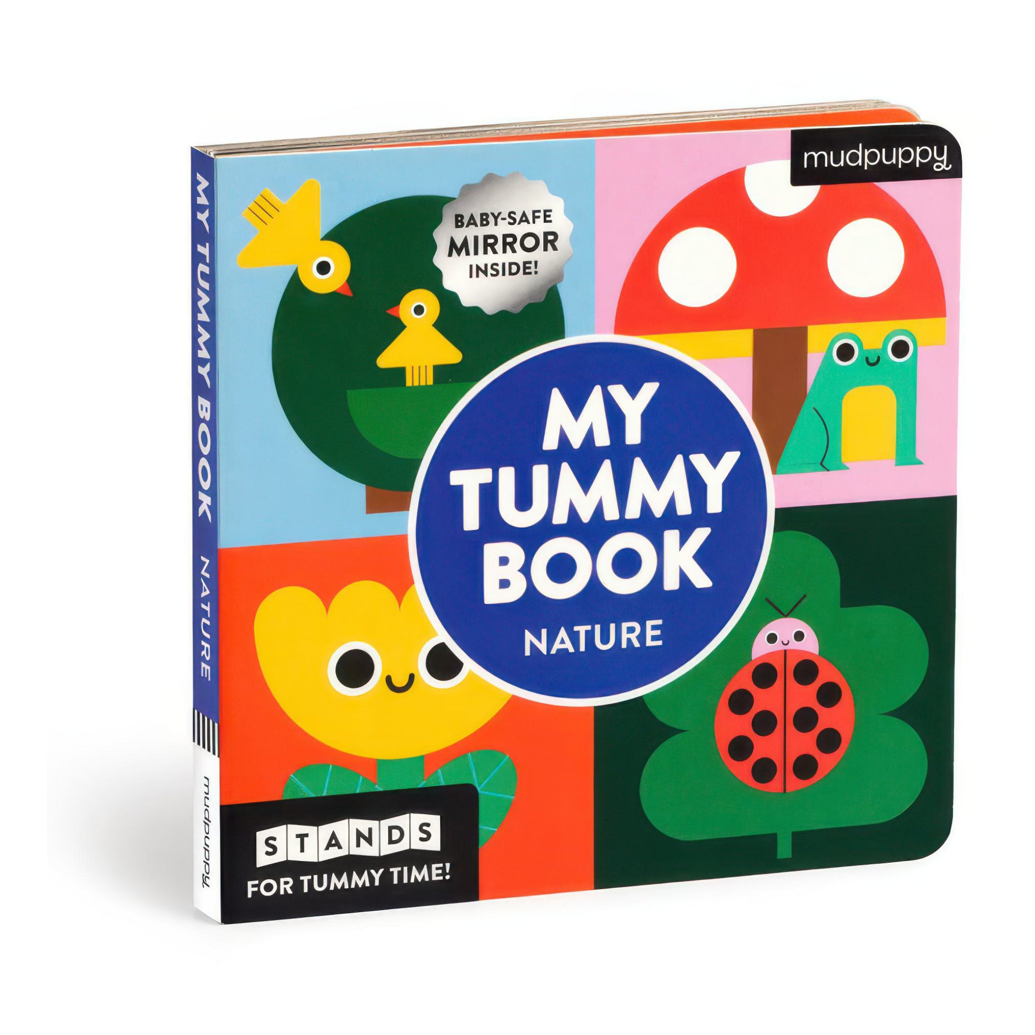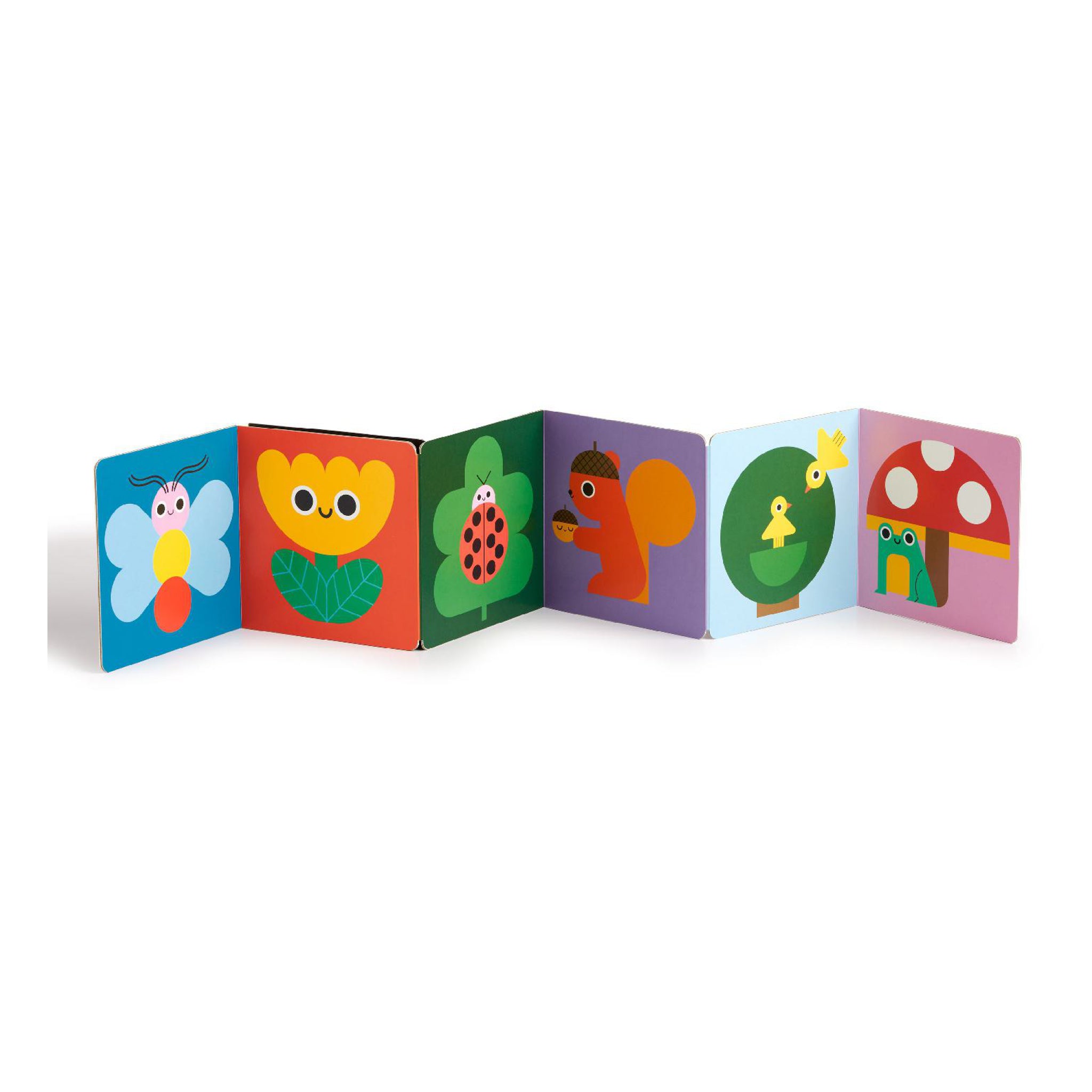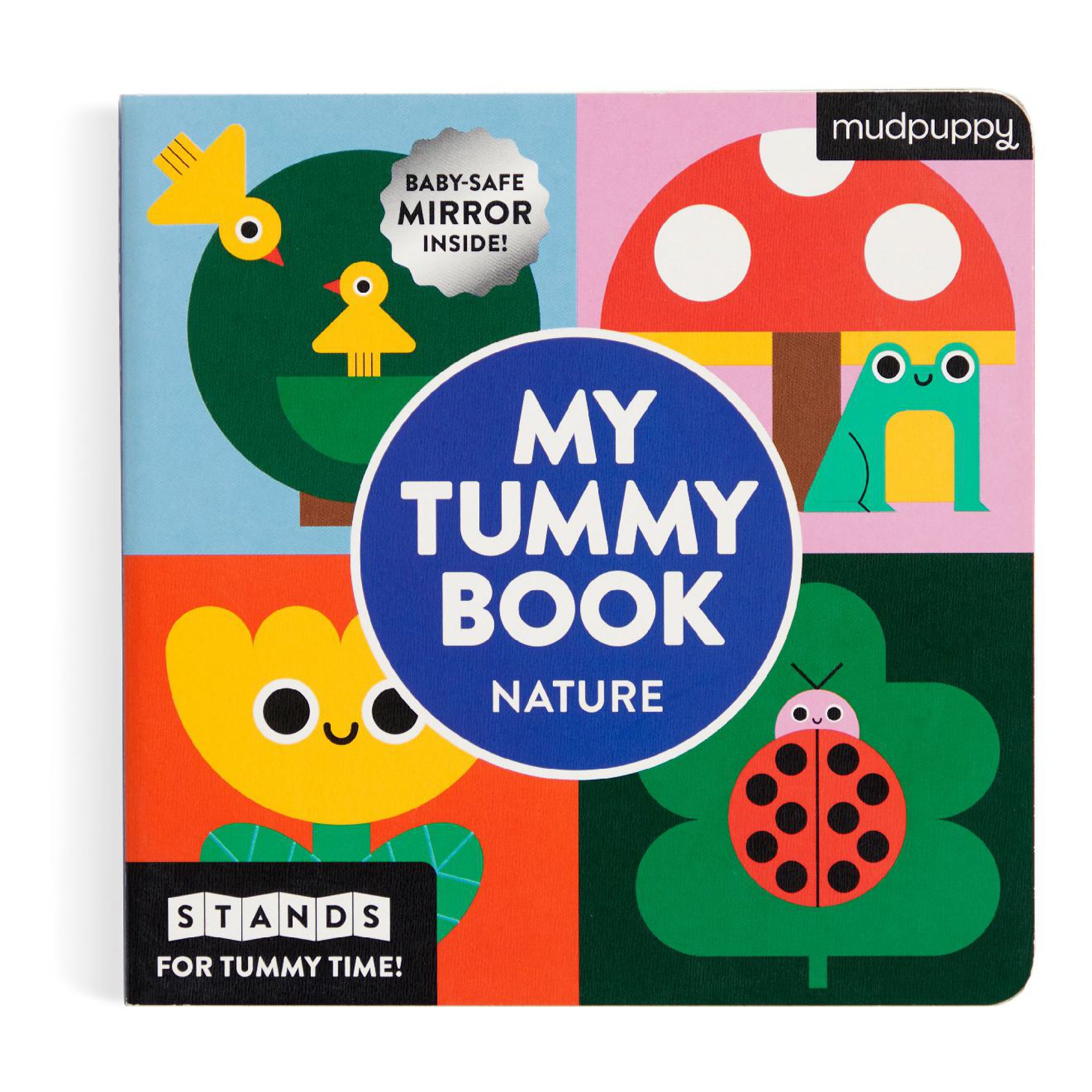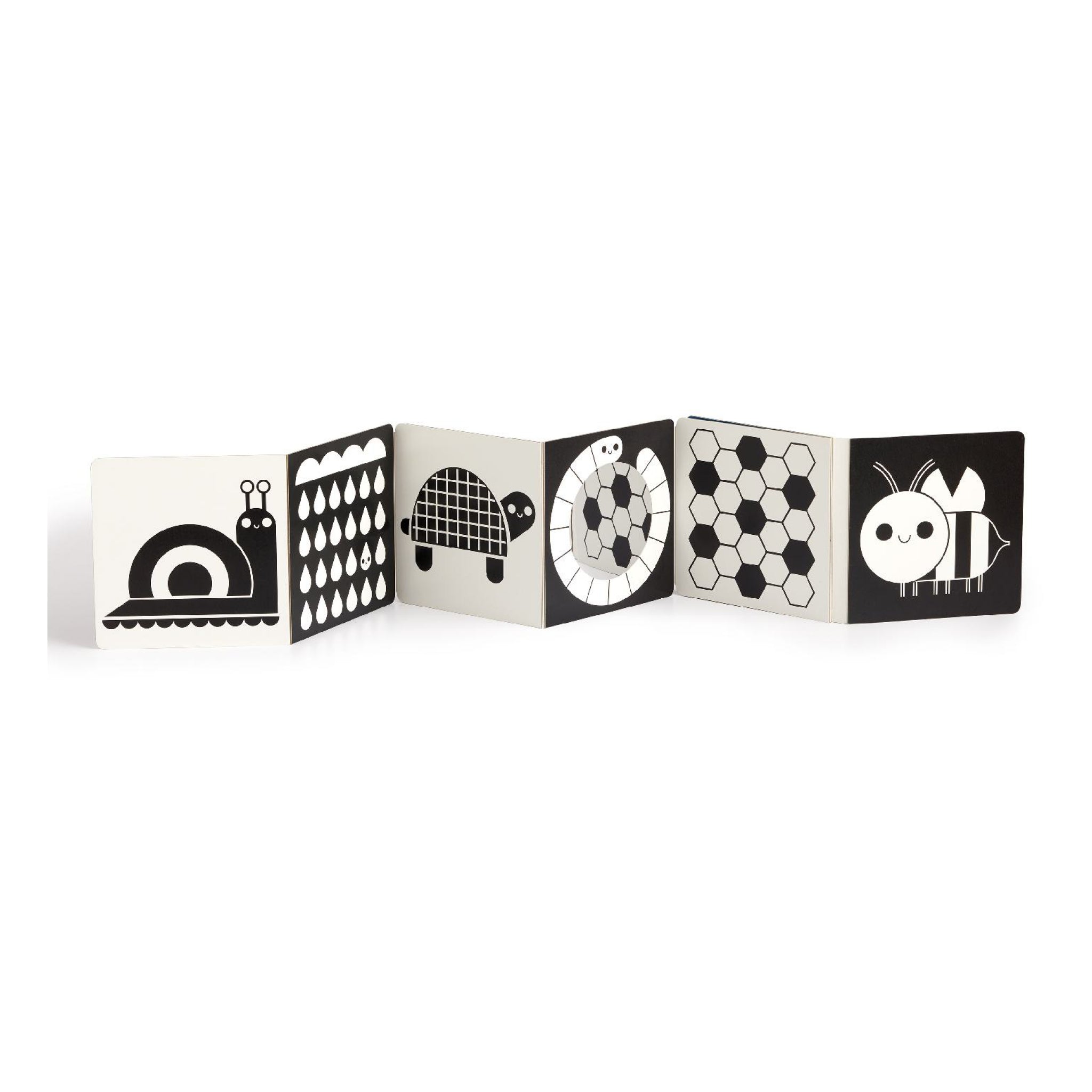 An accordion fold-out tummy time book that stands upright on a playmat, with bright nature scenes on one side and high-contrast black-and-white on the other. Includes a baby-safe mirror for extra peekaboo fun.