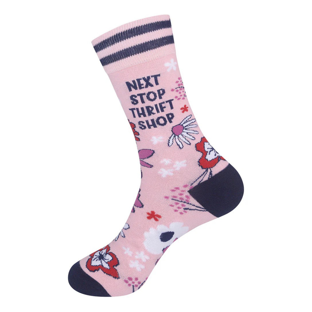 Next Stop: Thrift Shop socks are a love letter to bold florals, secondhand steals, and the thrill of the perfect find. With a soft pink background, punchy flowers, and navy accents on the toe, heel, and cuff, they bring retro-chic energy to every outfit.