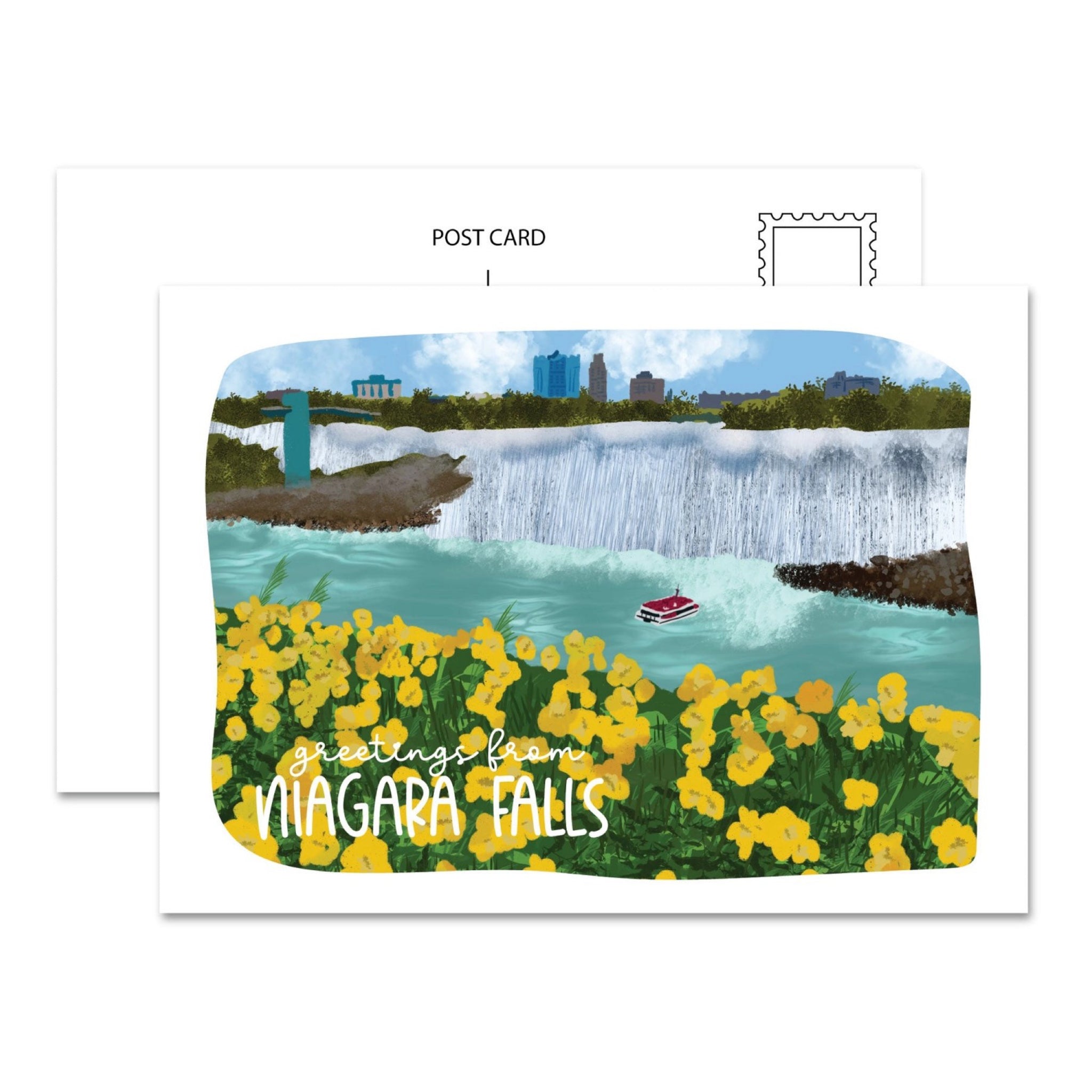 Send a little waterfall wow with this illustrated Niagara Falls postcard. Featuring a bright, scenic view and “greetings from Niagara Falls” lettering, it’s perfect for travel notes, souvenirs, or framing.