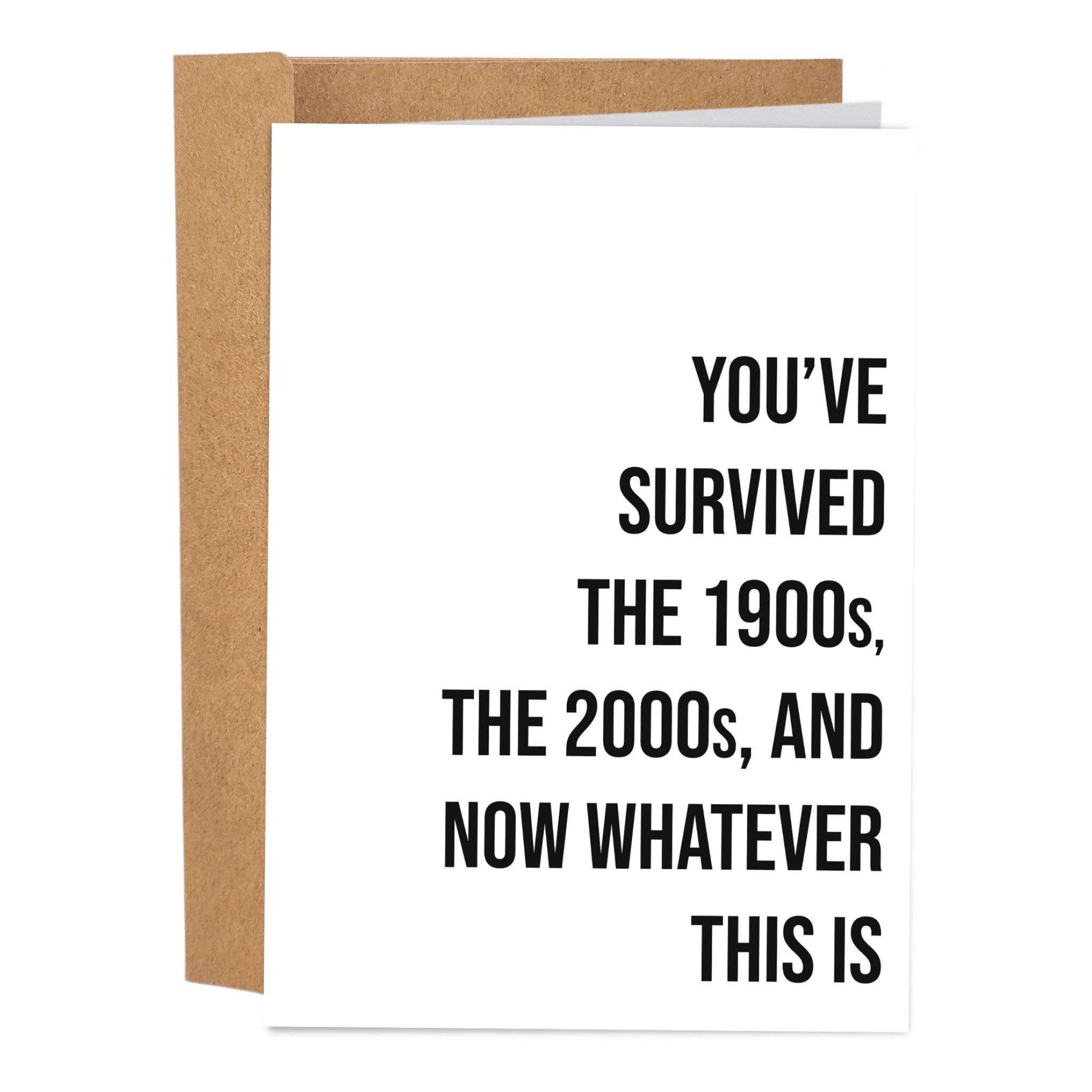 A funny birthday card for anyone who’s been through it all, with the message “You’ve survived the 1900s, the 2000s, and now whatever this is.” Blank inside for your own celebratory note.