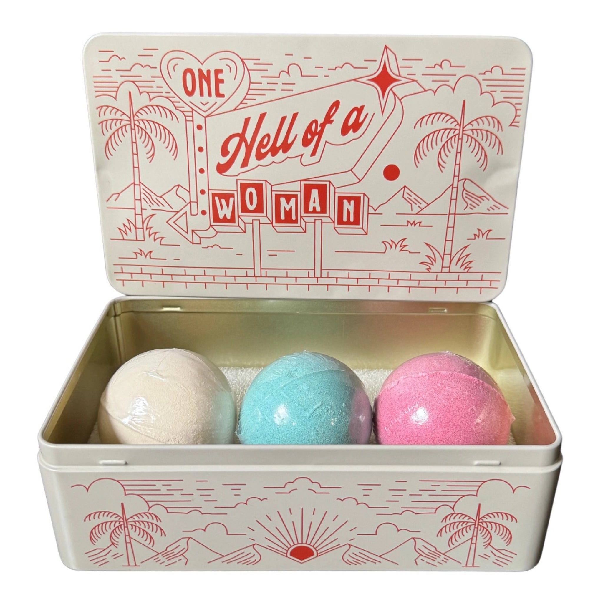 - Includes: 3 bath bombs and reusable tin box