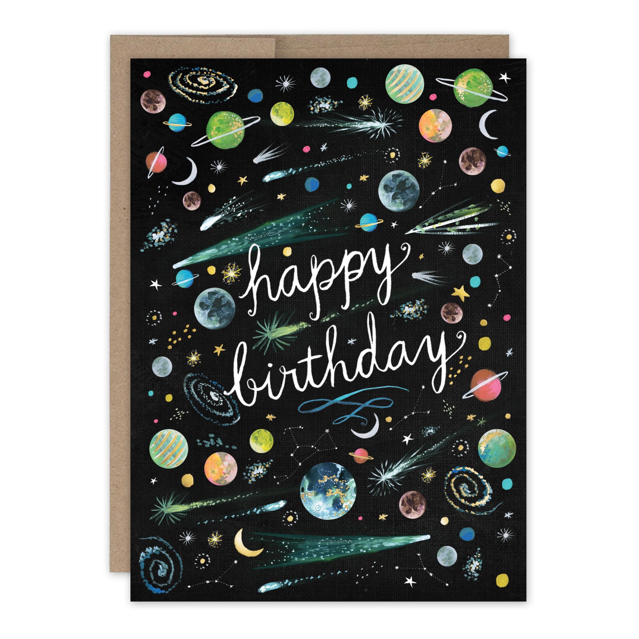 A cosmic birthday card filled with planets, stars, and swirling galaxies, finished with playful gold foil accents. A fun way to wish someone a truly out of this world birthday.