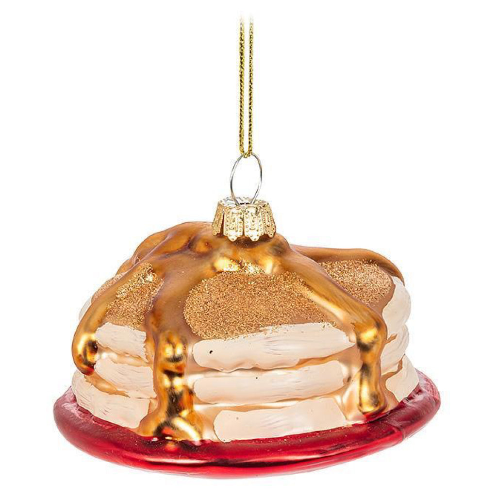 Satisfy your cravings with this mouthwatering Pancake Stack Ornament. Made of glass, it showcases a stack of pancakes drenched in syrup on a red plate. A delightful addition to any pancake enthusiast's Christmas tree.