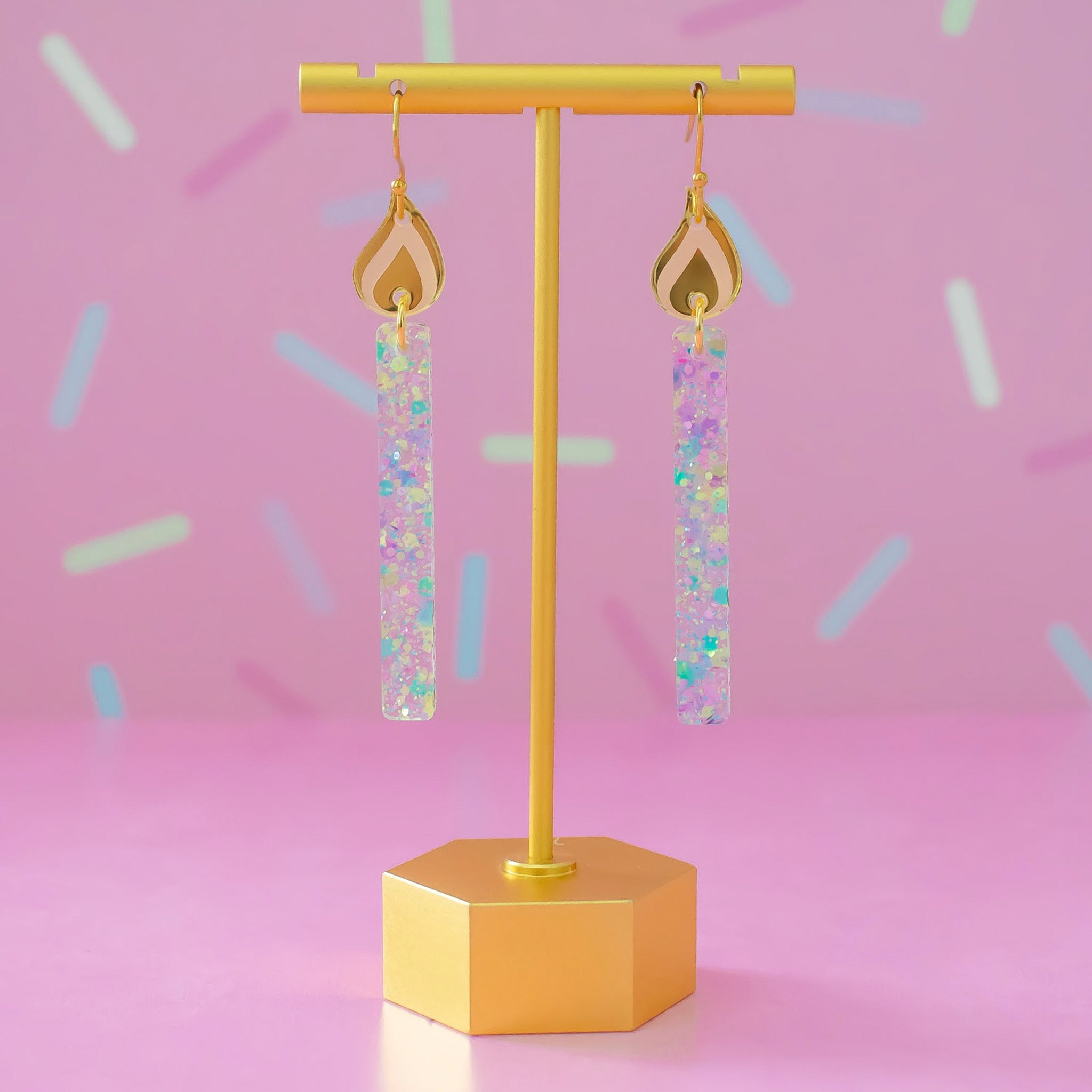 Make a wish and light up the celebration. These pastel confetti candle earrings mix glossy gold flame details with sparkling confetti acrylic for a playful, party ready statement that stays light all day.