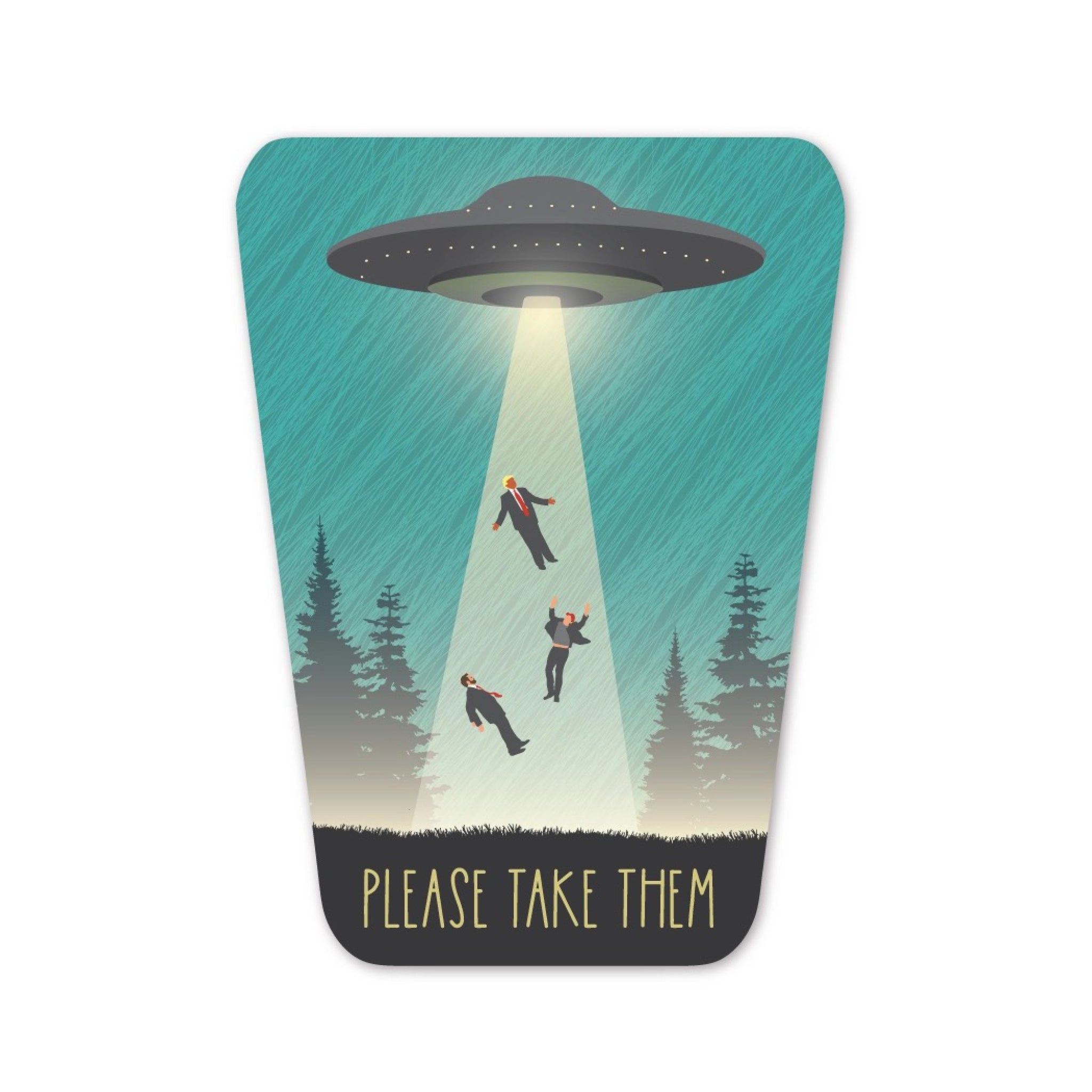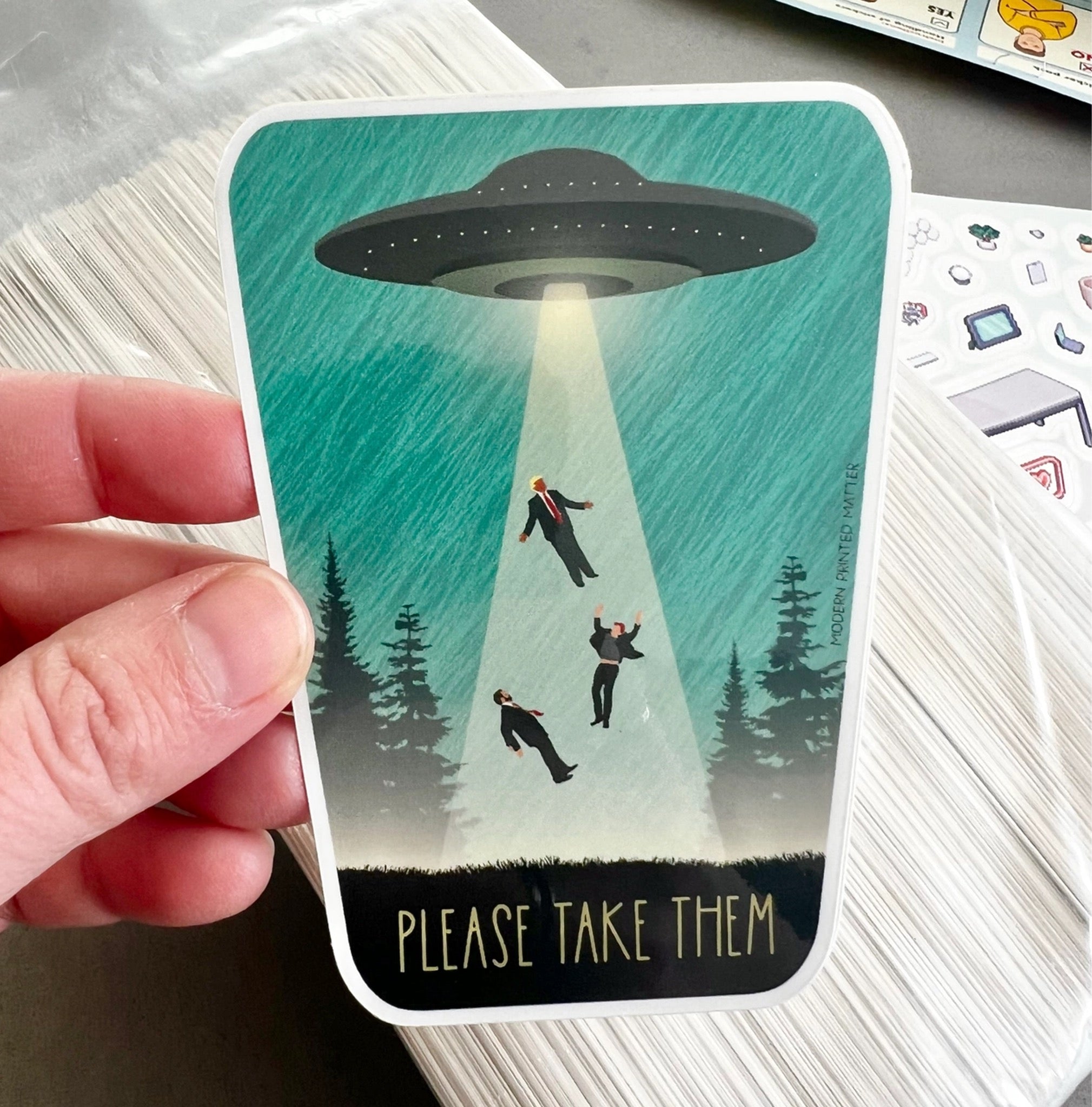 A quirky sci fi inspired sticker featuring a UFO beaming people you may recognize into the sky with the message “Please take them.” A fun way to add humor to laptops, notebooks, or water bottles.