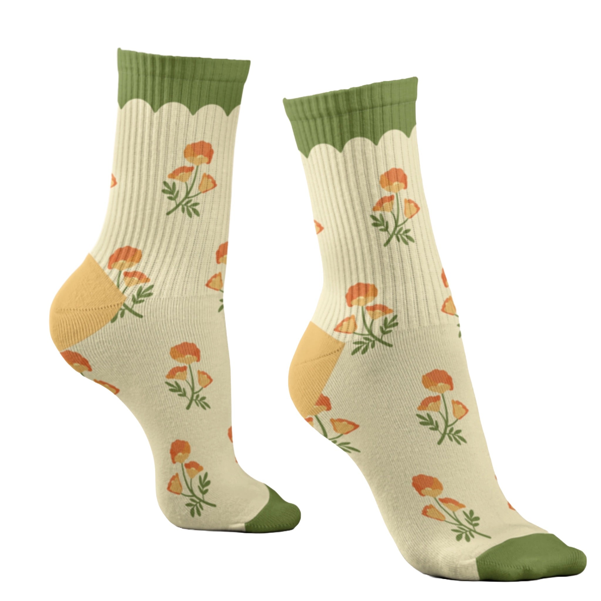 Bring a little bloom to every step. These athletic style crew socks feature cheerful orange poppies and a comfy ribbed fit, perfect for adding a fresh floral touch to everyday outfits.