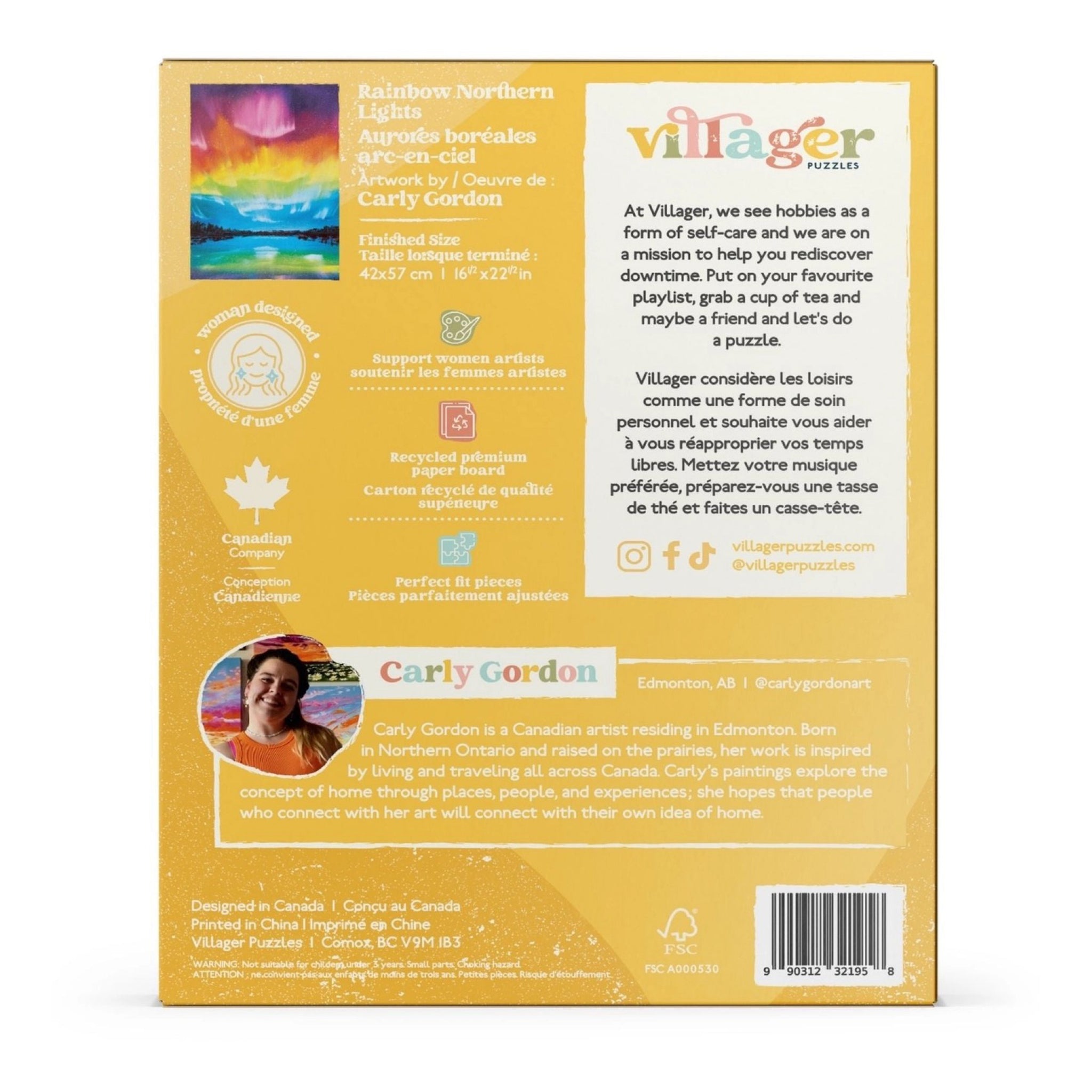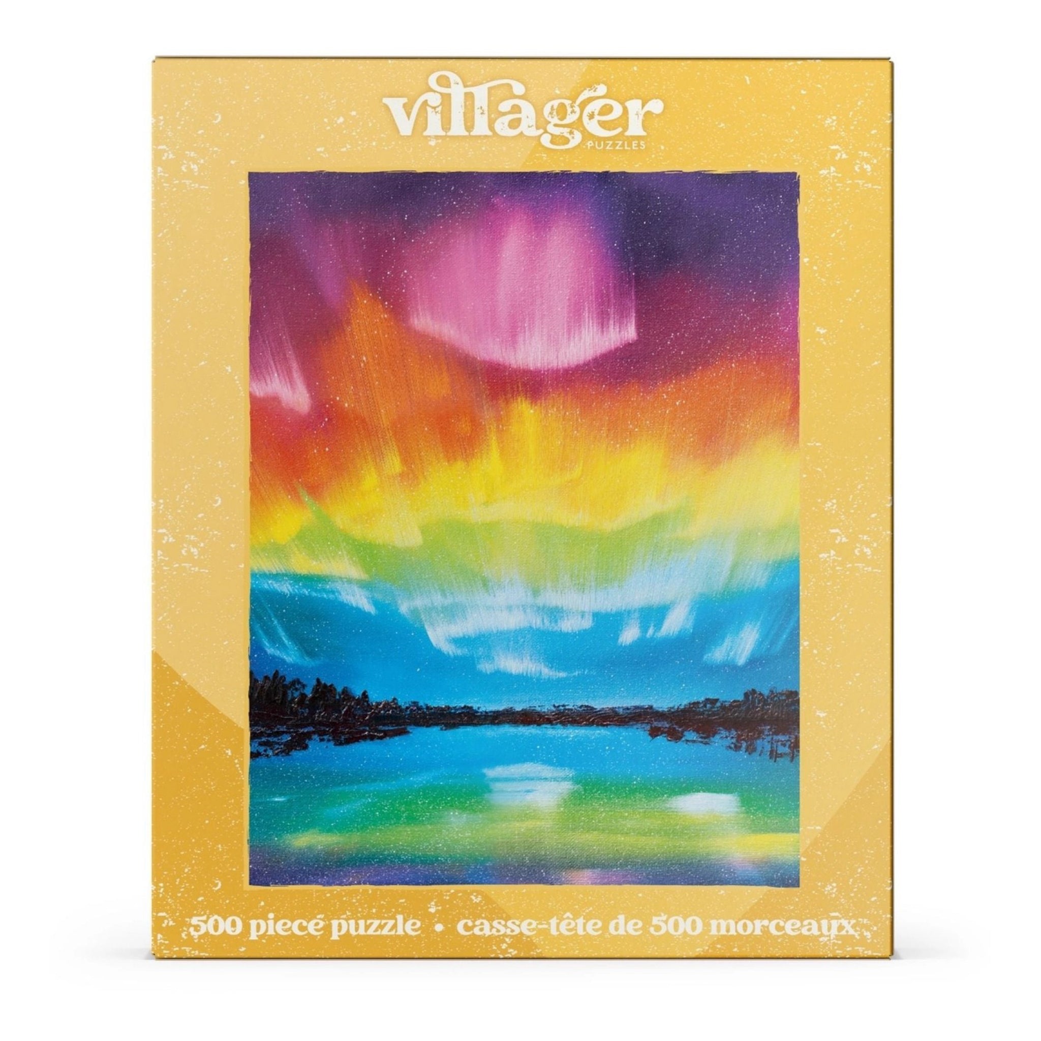 Vibrant 500 piece puzzle showcasing rainbow northern lights over Canada, featuring aurora borealis art that brings colour, calm, and puzzle joy. Beautifully painted by Edmonton artist, Carly Gordon.