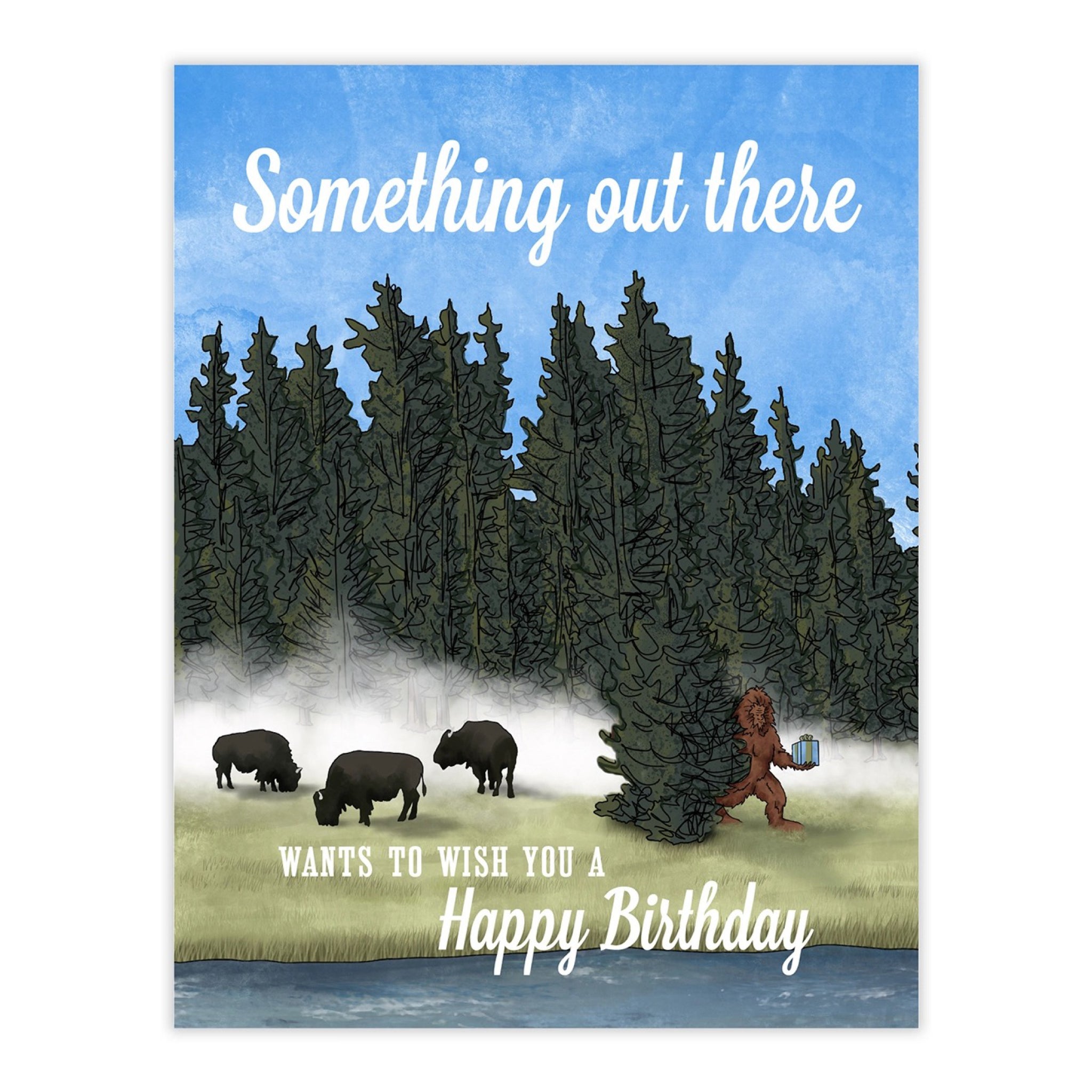 A fun birthday card featuring a sneaky sasquatch with a present, hiding in the trees with bison nearby and the message “Something out there wants to wish you a happy birthday.” Blank inside for your note.